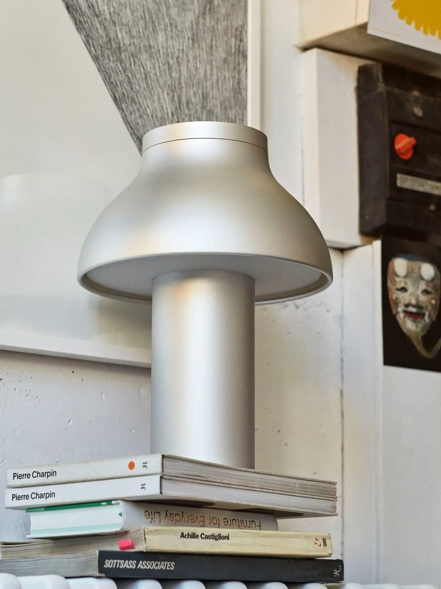 Den cylindriske base og den buede skærm skaber en fokuseret belysning, der er ideel til læsning eller arbejde. Lampens kompakte størrelse gør den særligt velegnet til mindre rum, hvor pladsen skal udnyttes optimalt.