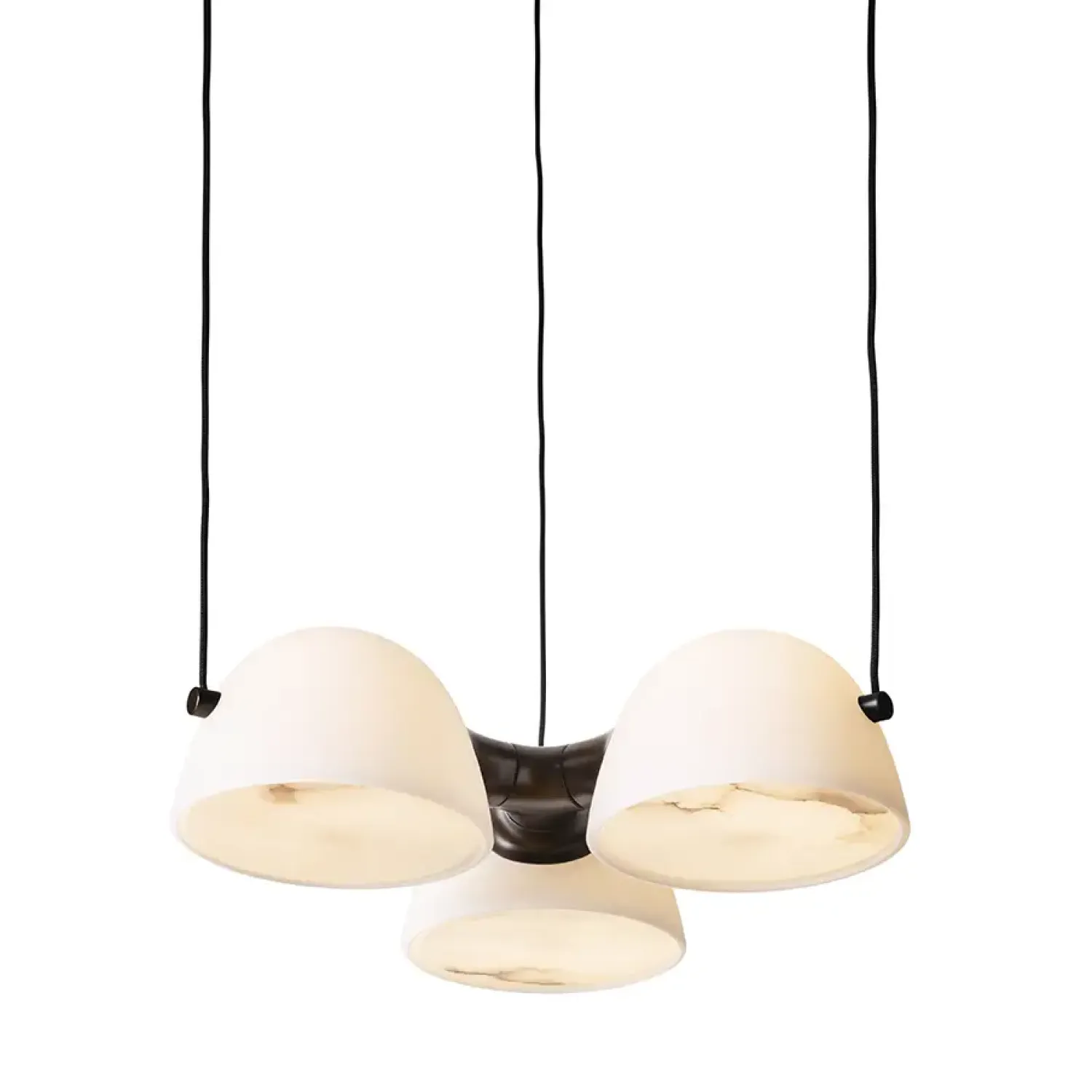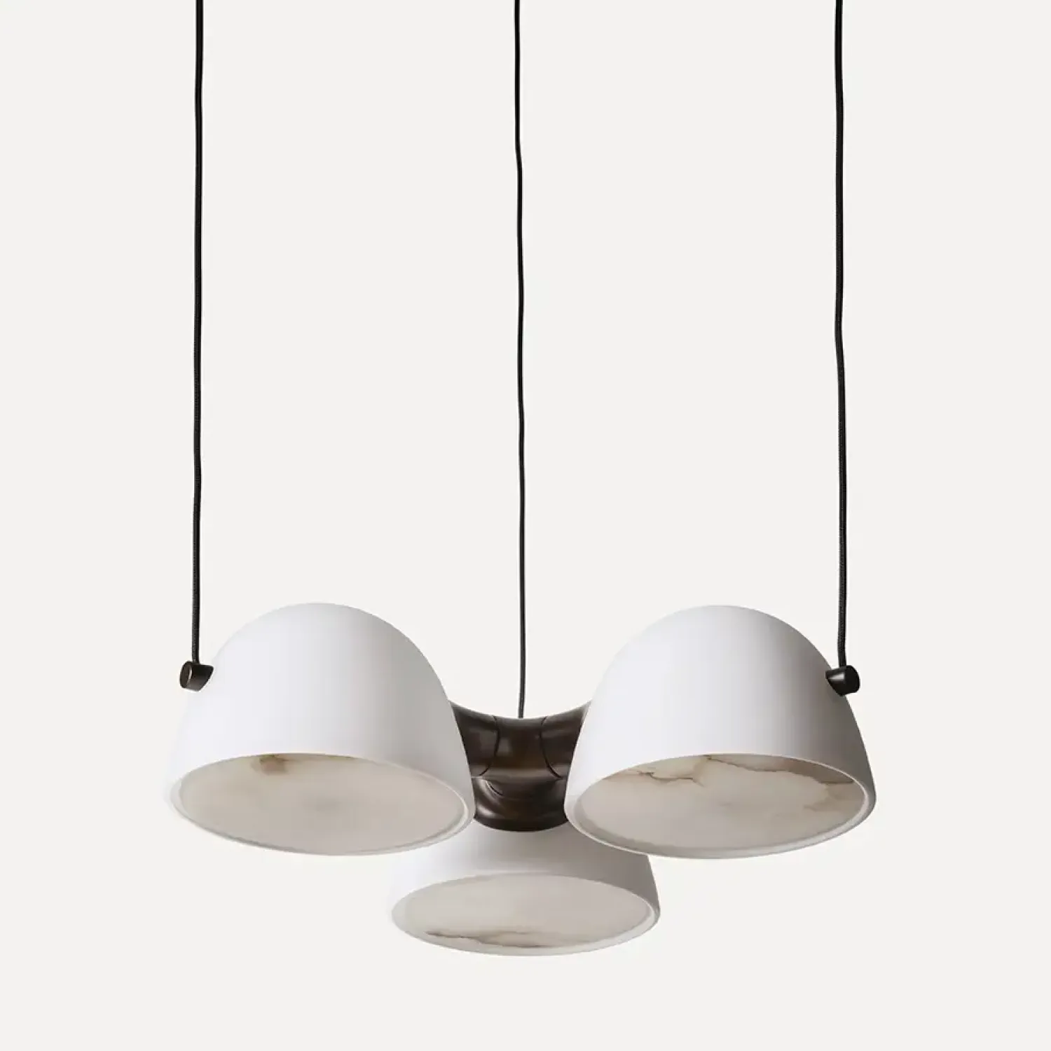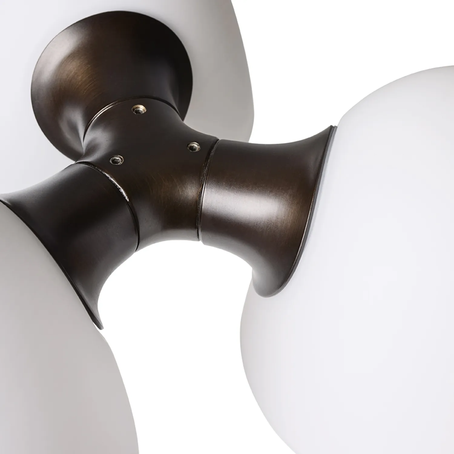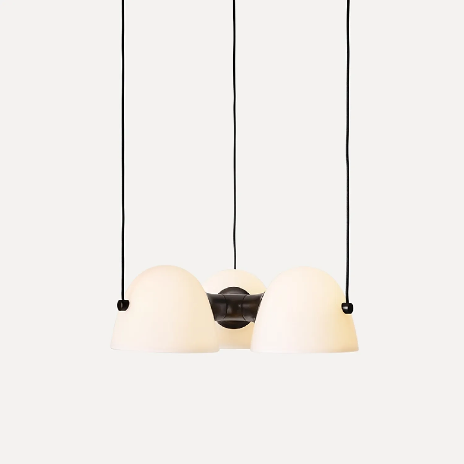 Fra FUSE-kollektionen kommer denne tredobbelte pendel, hvor patineret messing møder trelags opalglas. De tre kuppelformede skærme skaber en harmonisk belysning i dit rum med deres hvide finish.