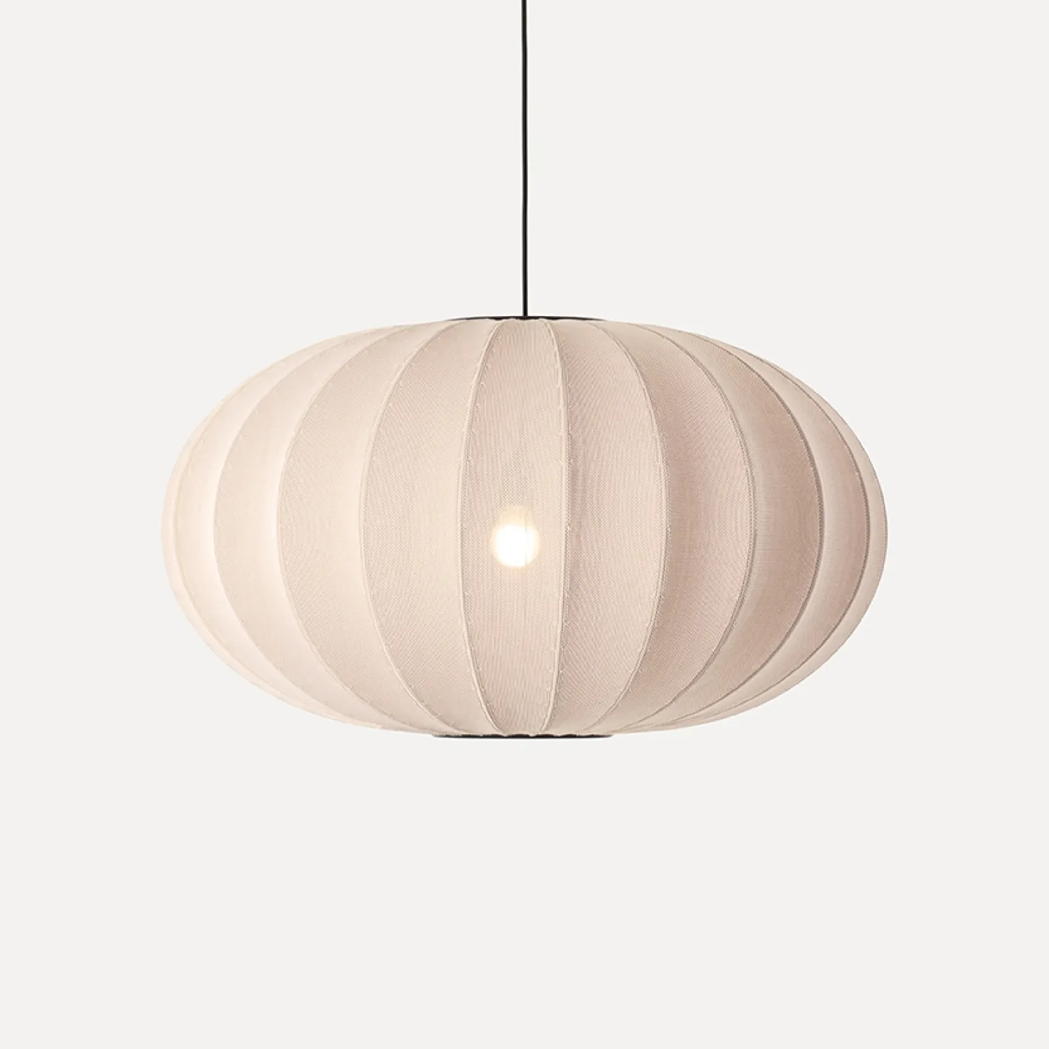 Dansk-produceret pendel med 3D-strikket overflade i genanvendt polyester. Den ovale form og sandsten-farven skaber et lysspil gennem den teksturerede overflade. Det indbyggede LED-modul giver præcis lyskontrol.
