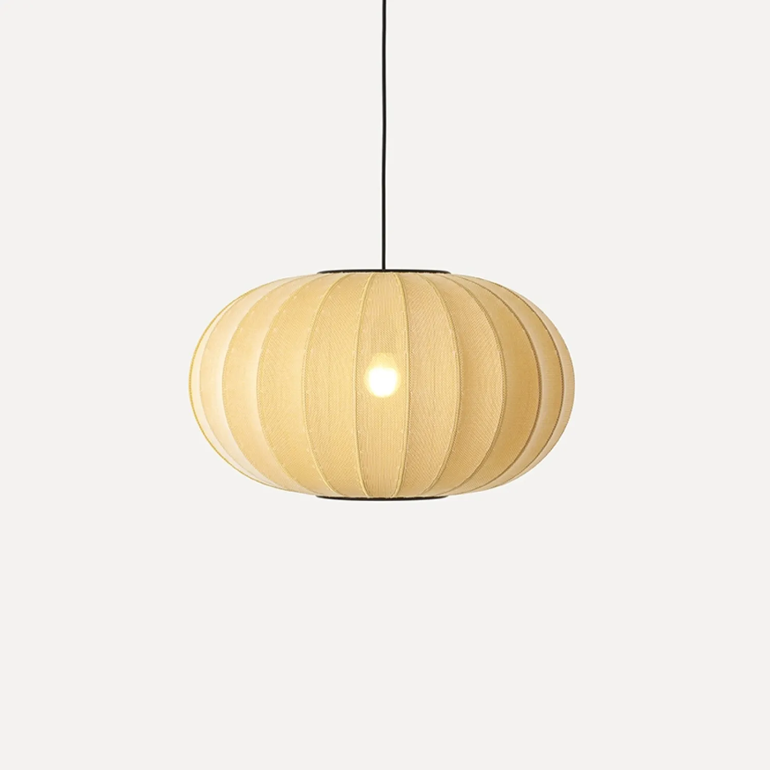 Denne danske pendel kombinerer nytænkende design med håndværk. Lampen er 35 cm høj og lavet af strikket, flamme-resistent genanvendt polyester, som giver et blødt udtryk i rummet.