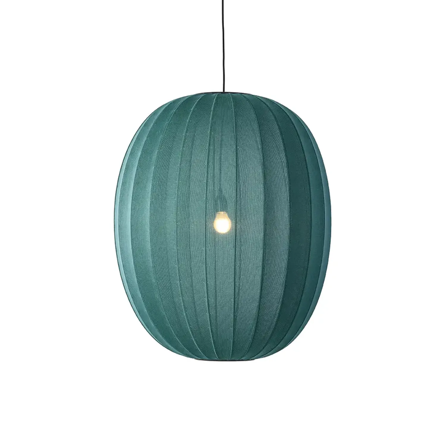 Lampen er lavet af 3D-strikket genanvendt polyester, som giver hver lampe et særpræg. Strukturen fordeler lyset jævnt, og materialevalget understøtter en mere miljøvenlig produktion.