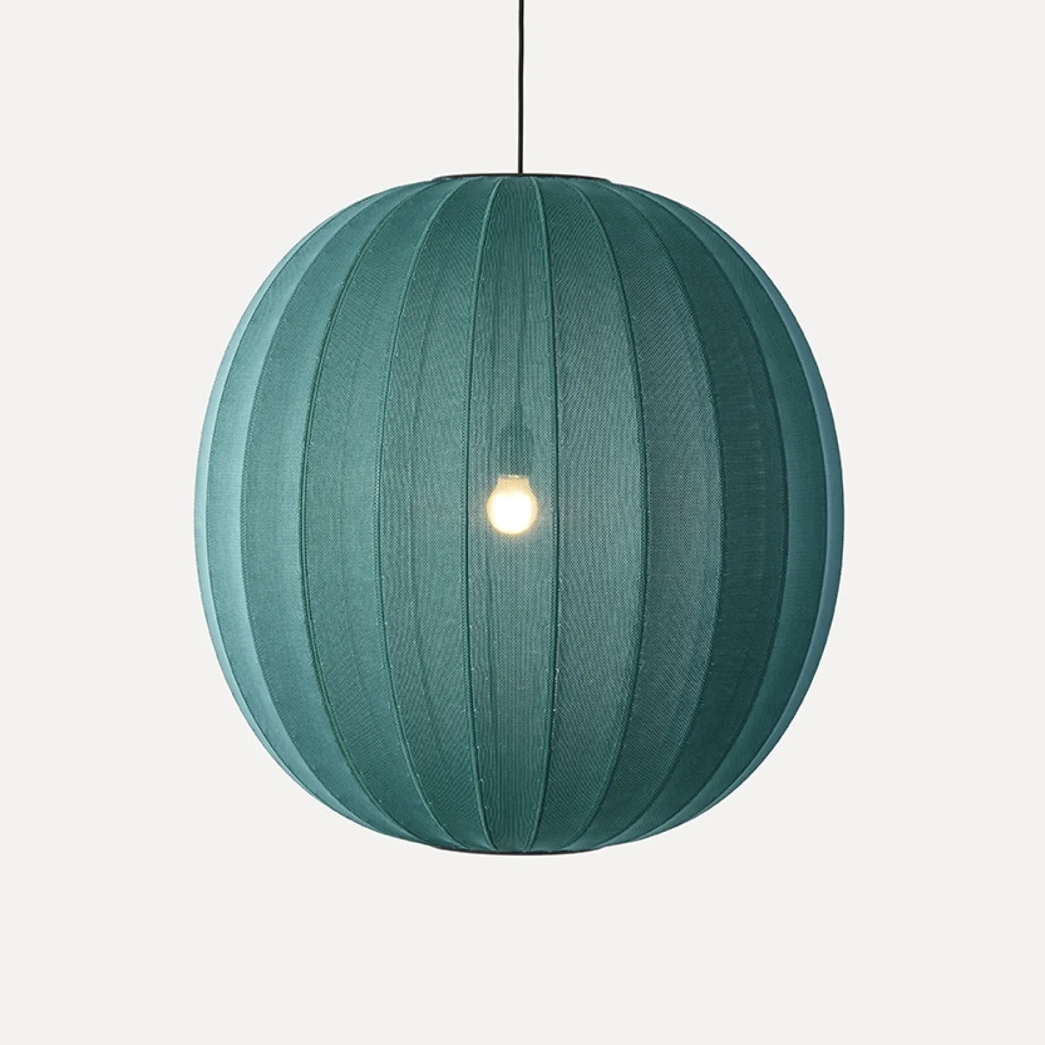 Denne runde pendel kombinerer strikket håndværk med moderne belysning. Fremstillet af genanvendte materialer i Danmark, skaber den med sine 69 cm karakter i rummet.