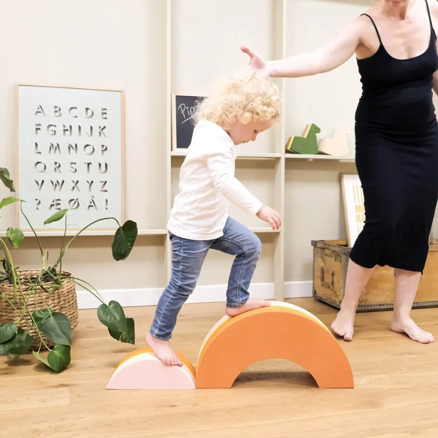 De lagdelte farver i pink, gul og orange skaber visuel interesse, der fanger børns opmærksomhed og inviterer til aktiv leg. Farverne er ikke bare pynt – de stimulerer sanserne og gør produktet let at integrere i legemiljøet. Strukturen med to separate dele giver dig mulighed for at variere legen og tilpasse sværhedsgraden.