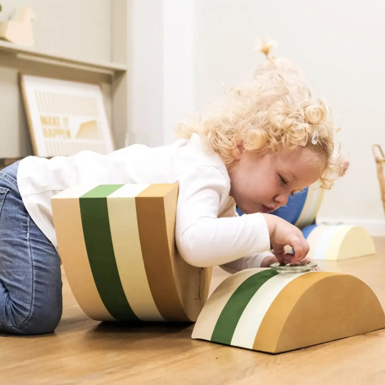 Denne balancebom består af to halvcirkelformede dele i forskellige størrelser, designet til at udvikle børns balance og motoriske færdigheder. Materialet er flerfarvet med striber i brun, grøn og hvid, hvilket giver en legende visuel profil i hjemmet.