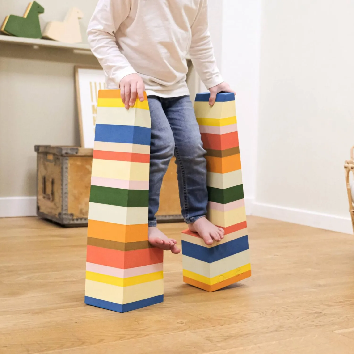Balanceøvelser med stylter hjælper børn med at udvikle deres motoriske færdigheder og kropsbevidsthed. De to høje stylter kræver koordination og koncentration, mens støtteklodsen giver ekstra stabilitet, når dit barn træner. Det farverige design med striber i flere farver stimulerer sanserne og gør legen mere engagerende for nysgerrige og eventyrlystne børn.