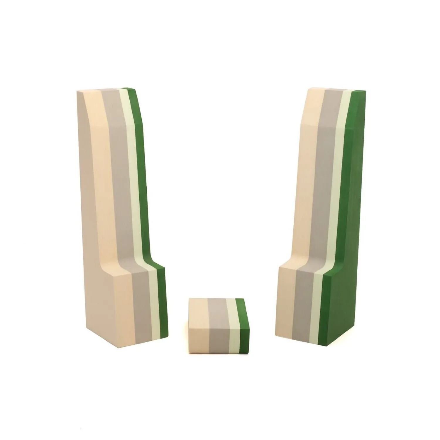 Disse cirkusstylter fra bObles leveres som et par og giver dit barn mulighed for at udvikle balance og motoriske færdigheder gennem aktiv leg. De rektangulære blokke har et skråt design med stribede mønstre i grøn og beige.