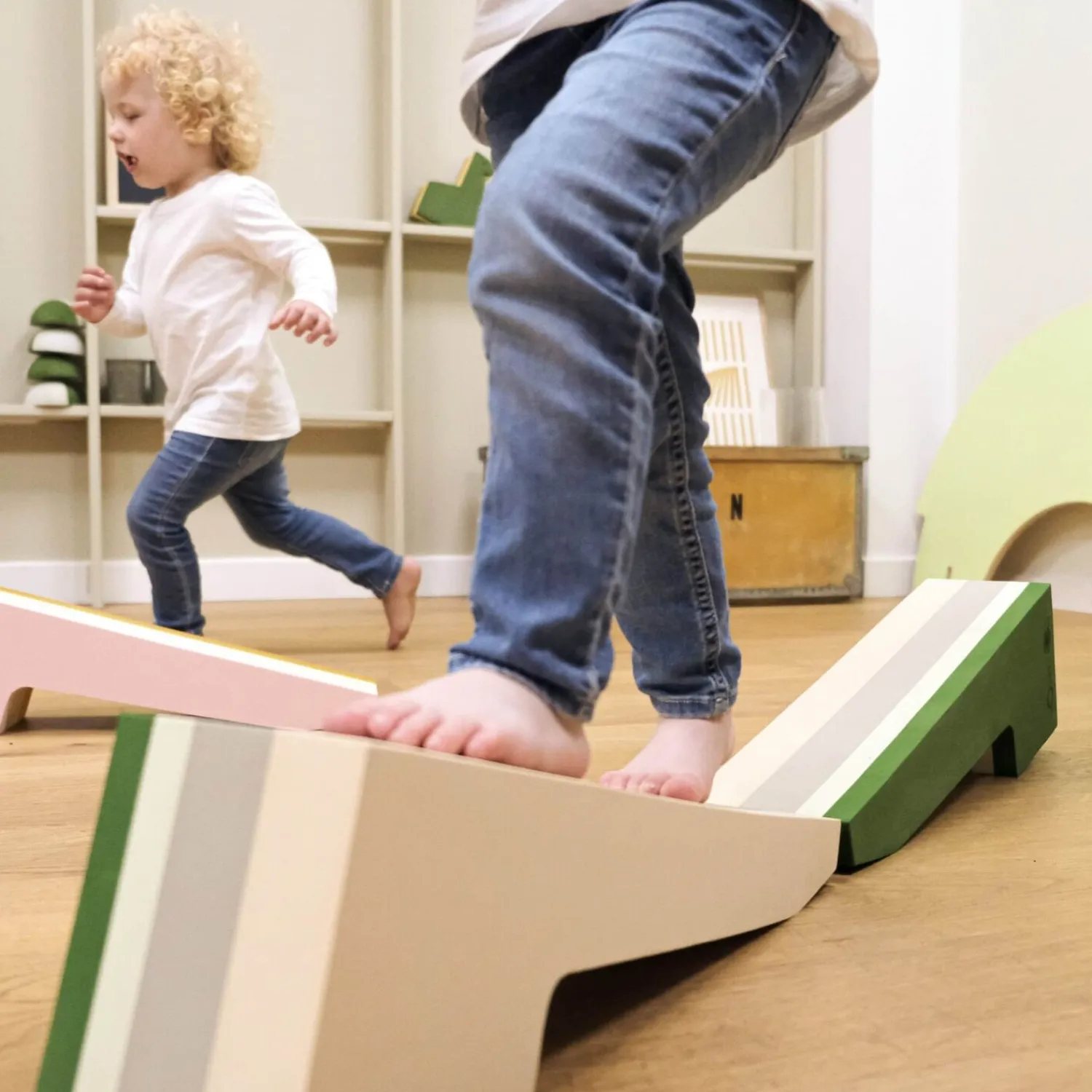 De skrå former opfordrer dit barn til at eksperimentere med balance og koordination. Stylterne giver en konkret måde at træne motoriske færdigheder på, mens det farverige design med grønne og beige striber tilføjer en visuel dimension til legen. Parret sikrer, at dit barn har det komplette sæt til aktiv udfoldelse.