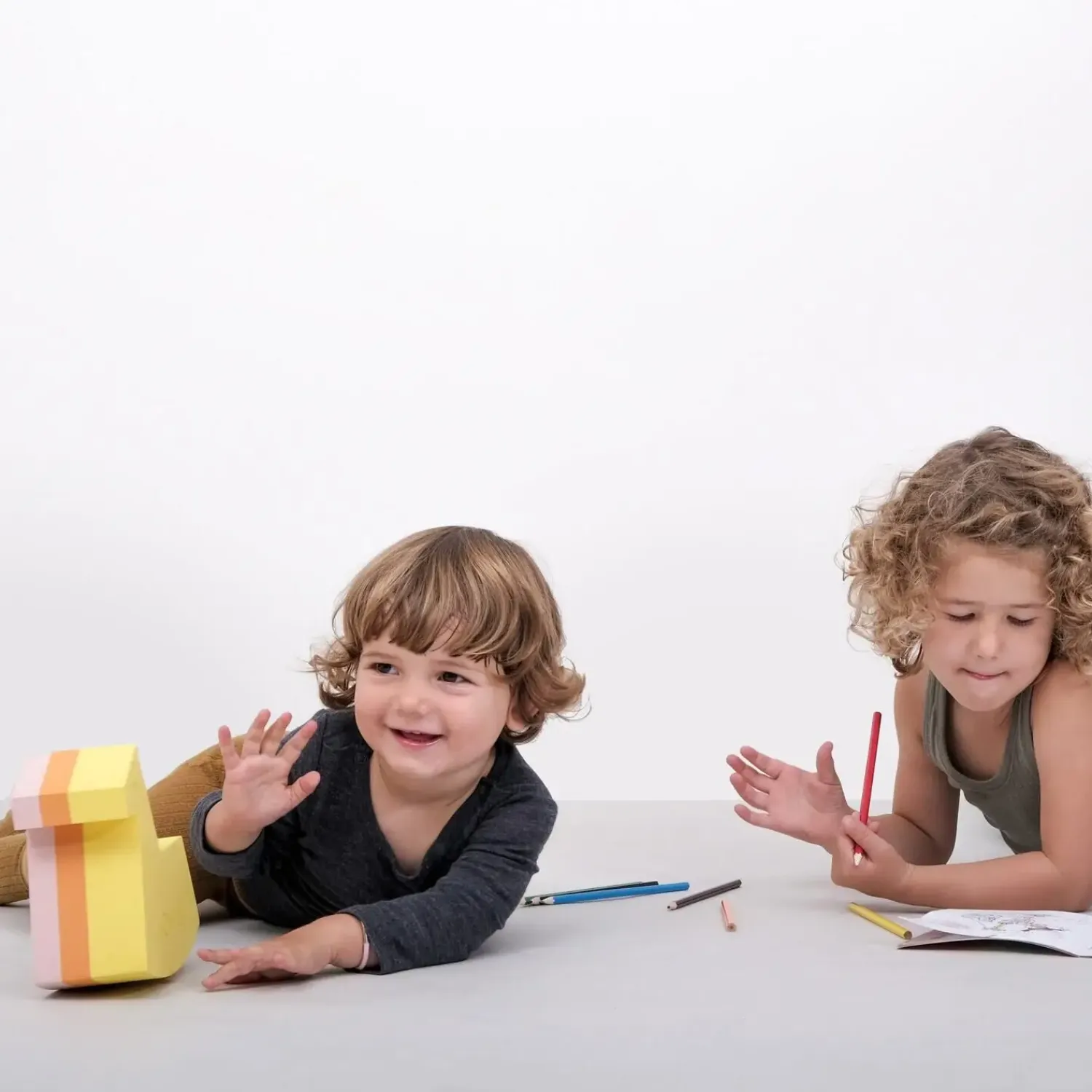 Minihestens størrelse er tilpasset små hænder, hvilket gør det nemt for børn at lege selvstændigt. Den kan også medbringes til badet, hvor den flyder på vandet og tilføjer en ekstra dimension til badetiden. Materialet er flerfarvet med lag af lyserød, orange og gul, som skaber visuel interesse uden at være overvældende.