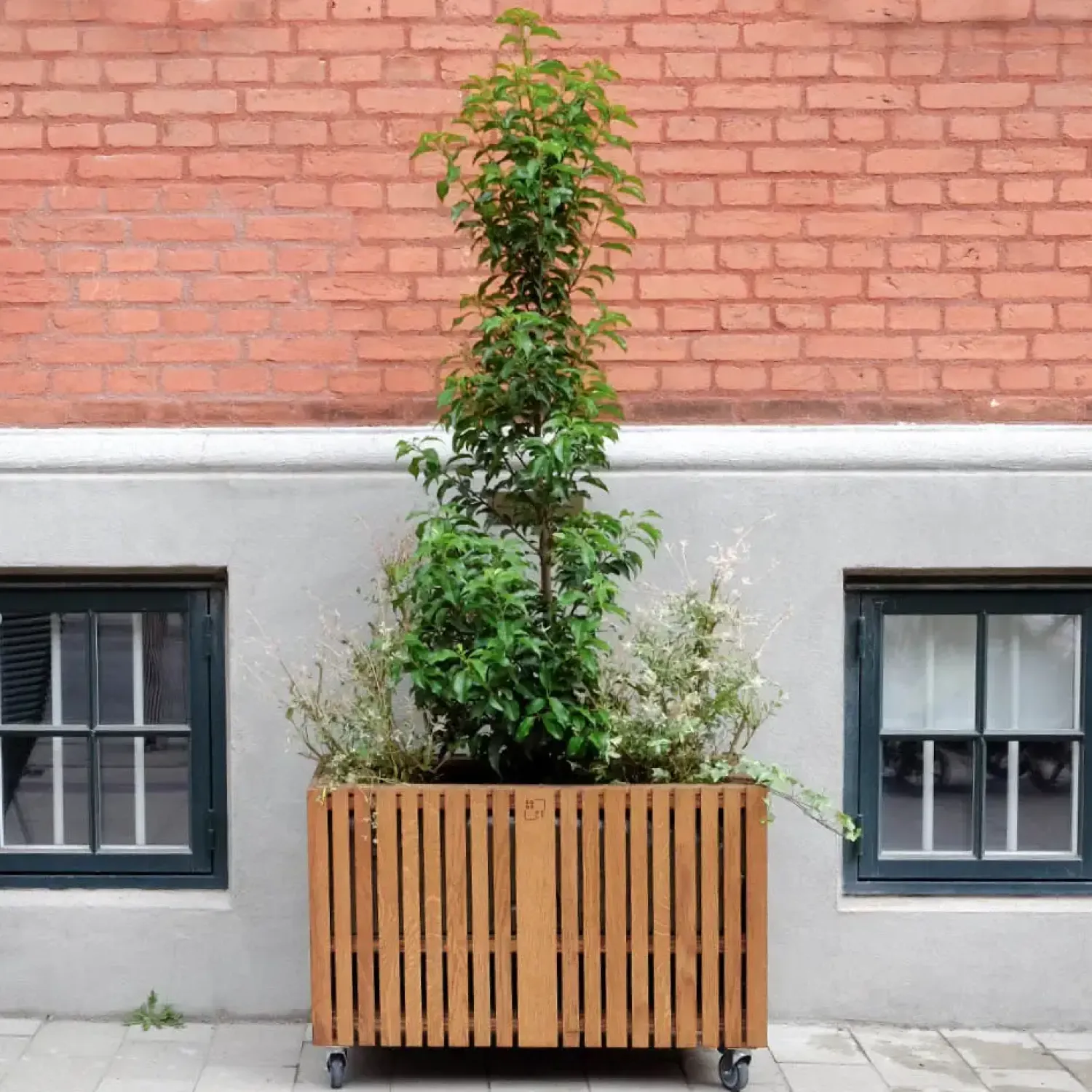 I restauranter og hoteller skaber plantekassen naturlige rumdelere. Selvvandingssystemet sikrer, at planterne trives uden daglig vedligeholdelse. De vertikale trælameller i mørk eg passer til forskellige indretningsstile og giver et naturligt præg.
