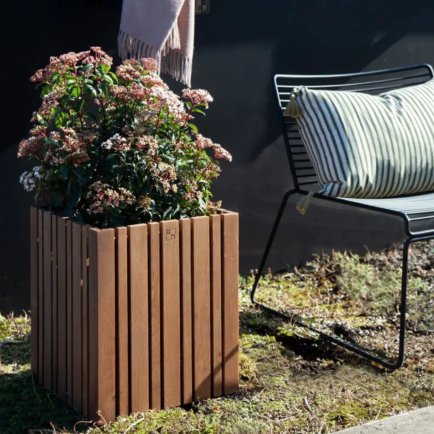 Kubiske linjer og mørkt egetræ passer ind i professionelle miljøer. Muligheden for hjulmontering gør det nemt at flytte plantekassen og tilpasse indretningen efter behov.