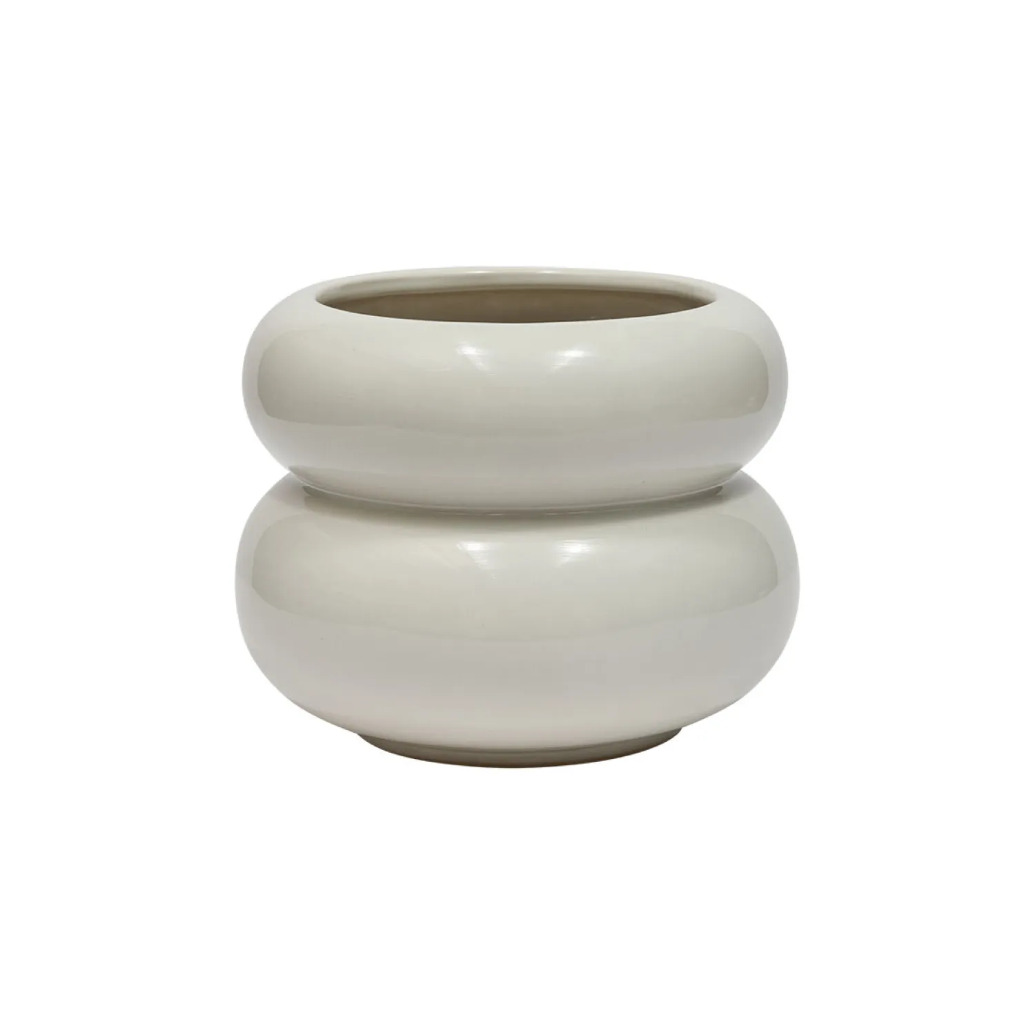 Denne keramiske potte fra OYOY kombinerer et karakteristisk dobbelt-bulb design med praktiske mål på L23 x B23 x H19 cm. Den blanke overflade reflekterer lyset smukt og skaber dybde i rummet.
