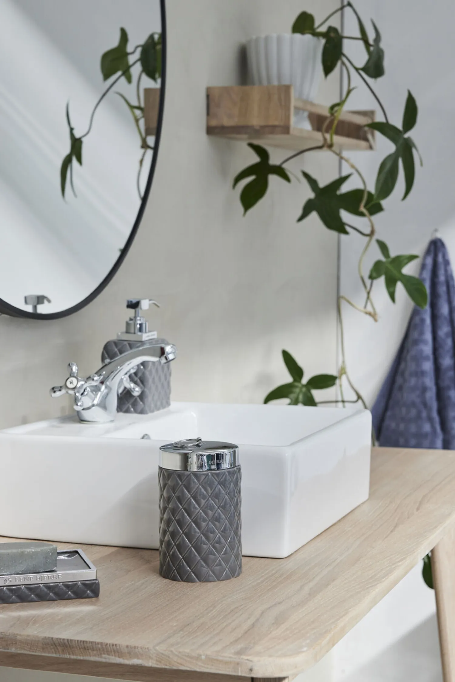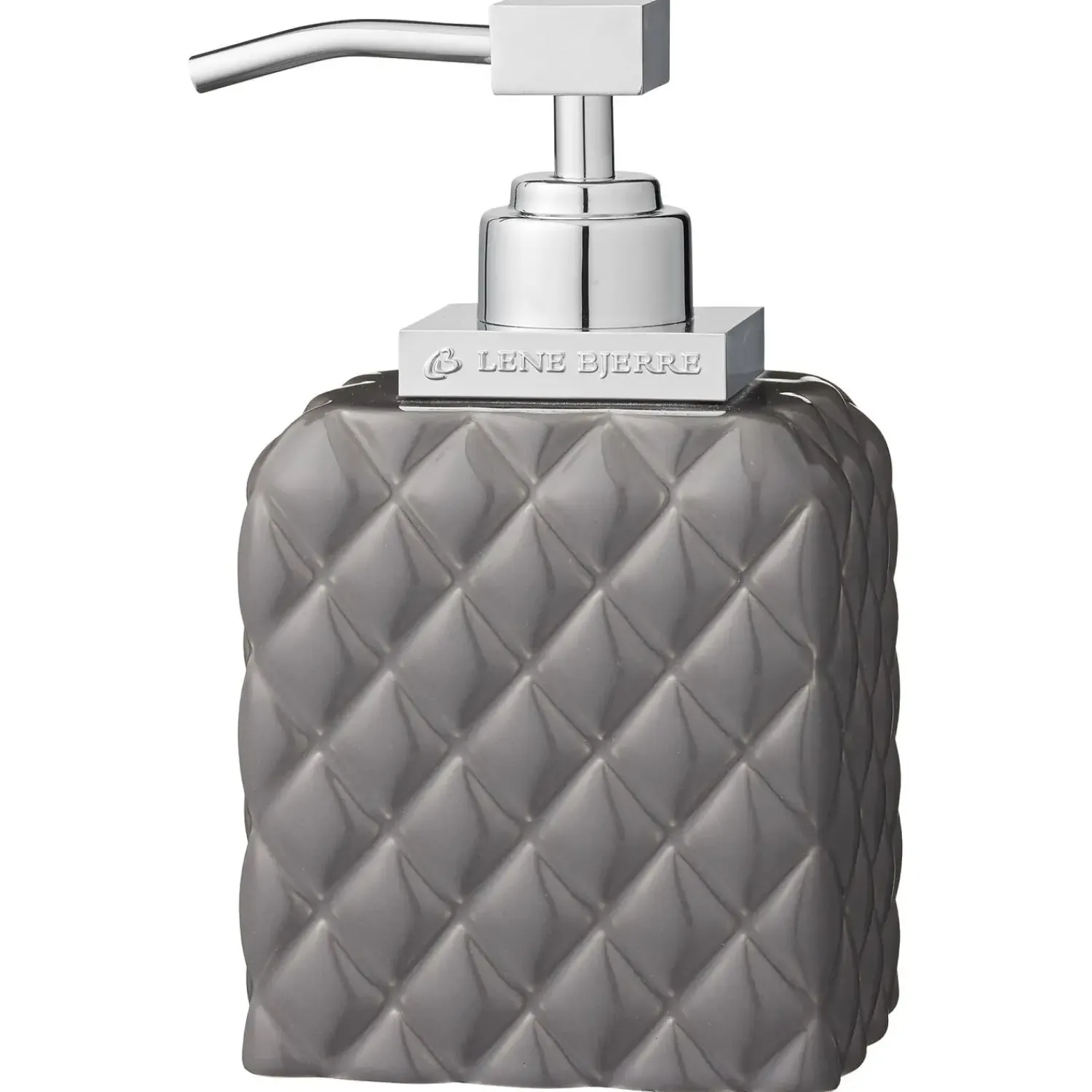 Smuk dispenser med sølv pumpe og grå harlekin design fra Lene Bjerre. Denne Portia dispenser er fremstillet af keramik og måler L9xB7xH16 cm. Dispenseren er med sit unikke og elegante design både dekorativ og praktisk på et hvert badeværelse. Den afspejler stil og modernitet og det fine harlekin design indfanger en helt speciel stemning. Hos Lene Bjerre har vi skabt et bredt sortiment af dispensere, hvor funktionalitet og design er i fokus. Vi anbefaler at rense pumpen regelmæssigt, for at opretholde den optimale effekt.