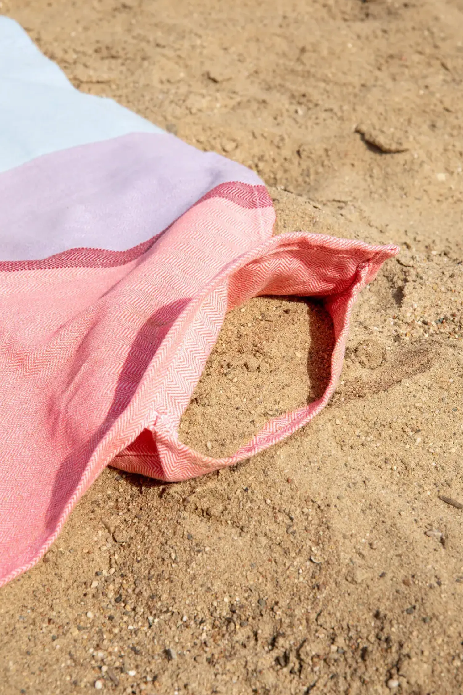 Dette håndklæde er designet til at gøre dine udendørs aktiviteter problemfrie og behagelige. De fire hjørnelommer kan fyldes med sand eller sten, så håndklædet forbliver på plads, selv når vinden blæser. Dette nyskabende design sikrer, at du kan slappe af uden bekymringer. Det flerfarvede mønster med klare sektioner tilføjer ikke kun et strejf af stil, men gør det også nemt at finde dit område på en travl strand. Materialets sammensætning af 90% bomuld og 10% genbrugspolyester giver en blød og komfortabel overflade, der samtidig tørrer hurtigt og er modstandsdygtig over for sand og fugt. Efter en dag fyldt med sol og sand er rengøringen enkel. Håndklædet kan vaskes ved 30°C på en skånsom cyklus, så det er klar til dit næste eventyr.