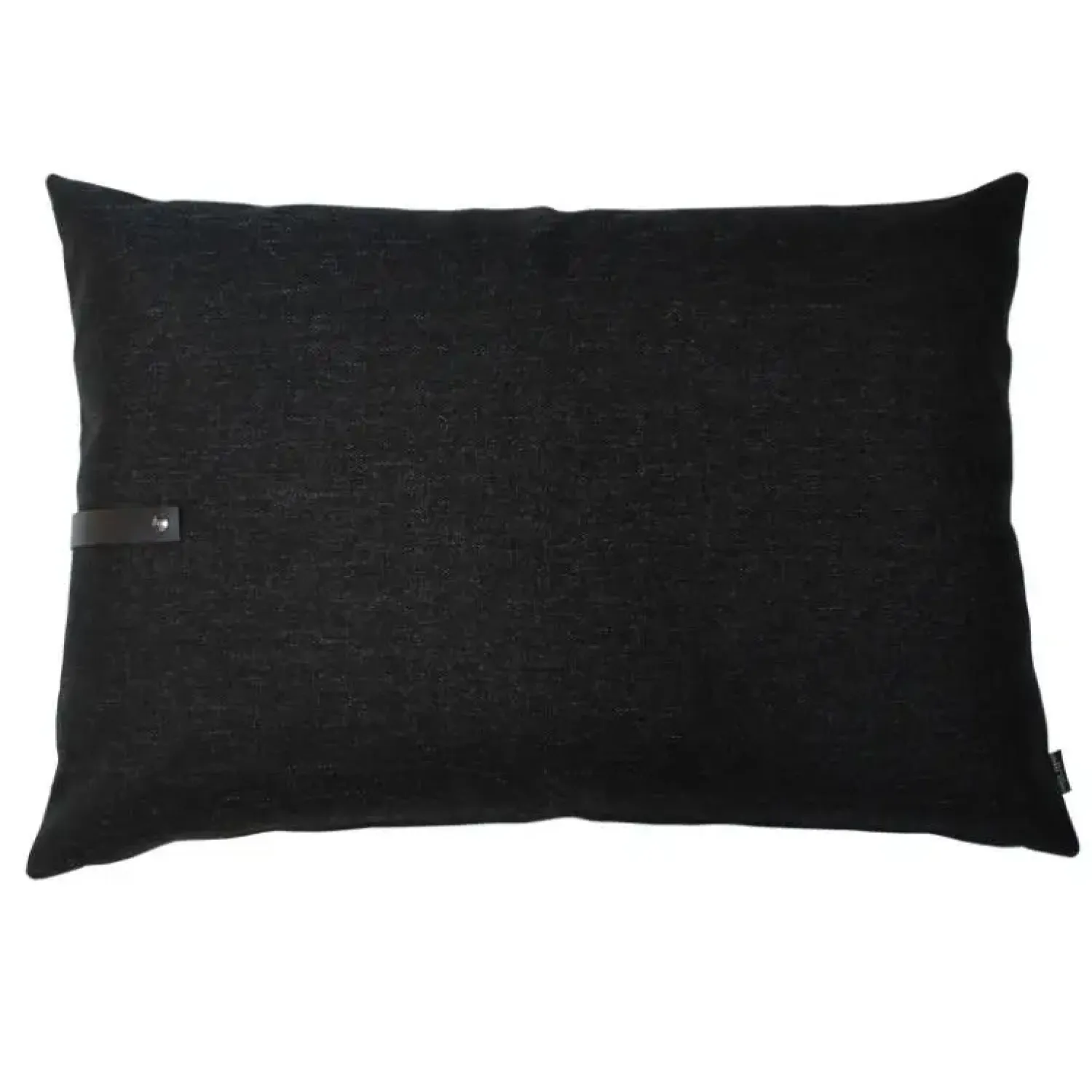 Super flot pude, syet i dejligt blødt mono twist af fineste kvalitet, som giver et simpelt og lækkert udtryk, som gør, at den kan styles på mange måder og passer ind i hjem med forskellige indretningsstile. Puden er påført en læderrem i sort kernelæder. Læderremmen går igen i Louise Smærups tekstildesigns, og skaber en diskret, men unik signatur for hendes forskellige designs.
