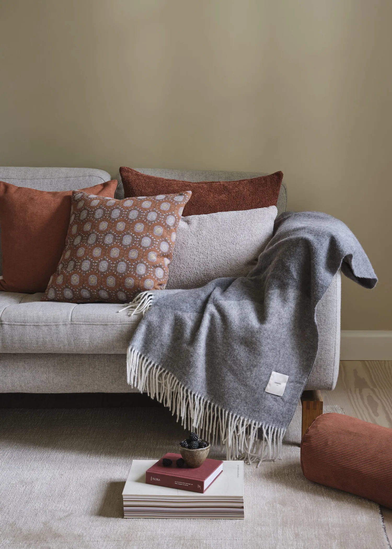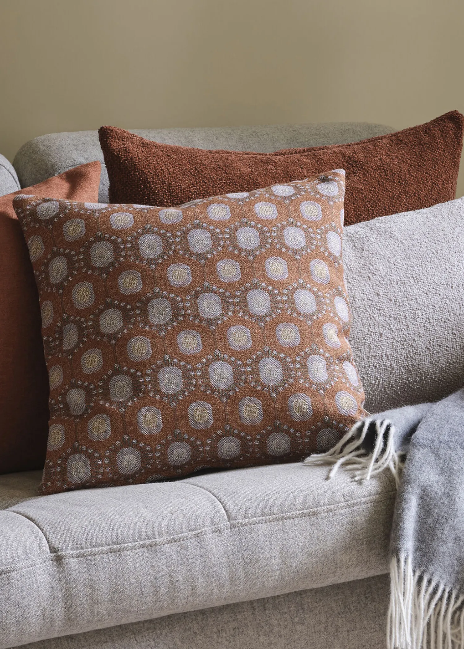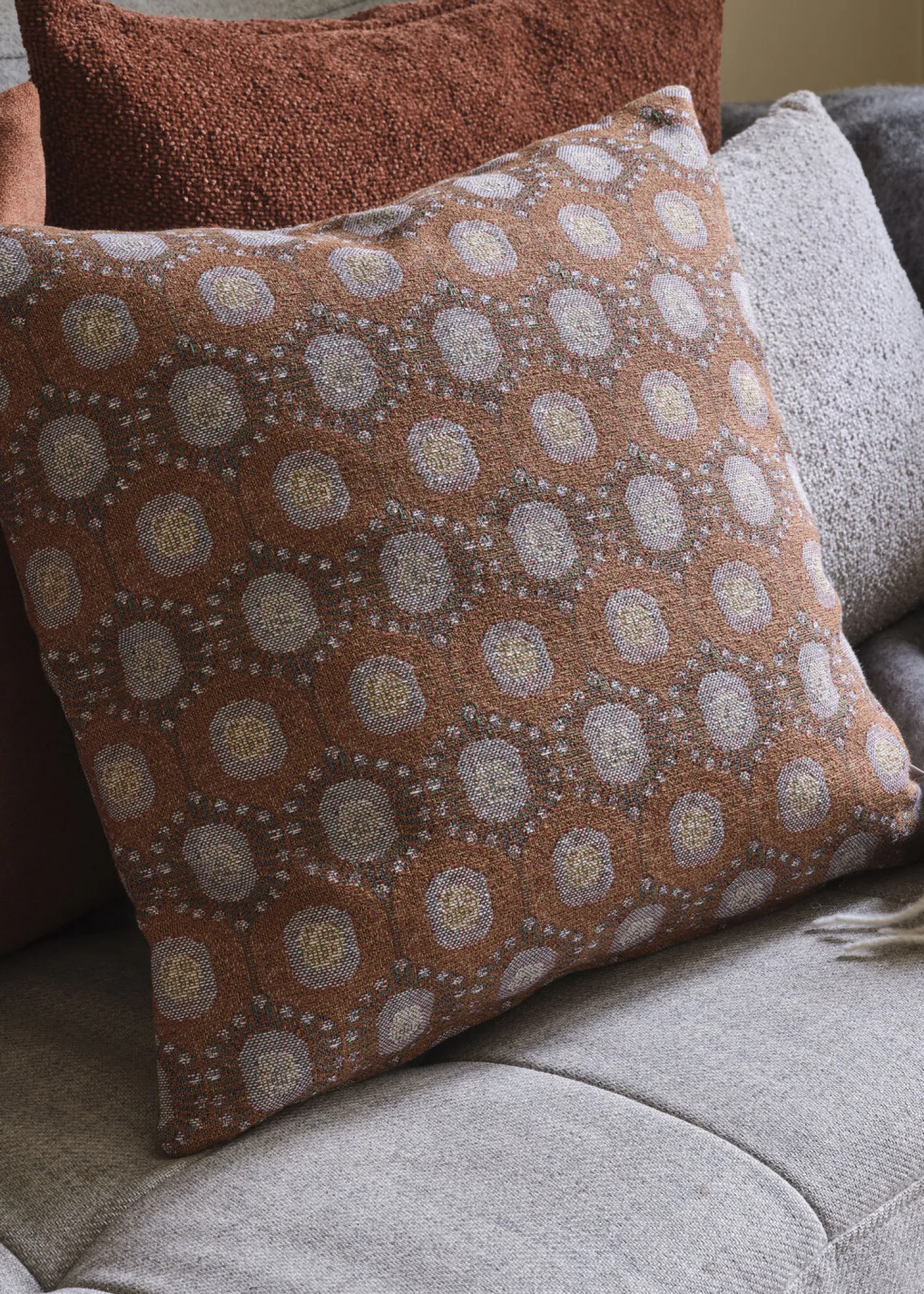 Det rustfarvede mønster giver dig mange kombinationsmuligheder i din indretning. Betrækkets neutrale grundtoner fungerer godt sammen med både lyse og mørke farver, og det cirkulære design tilfører dynamik til rummet.