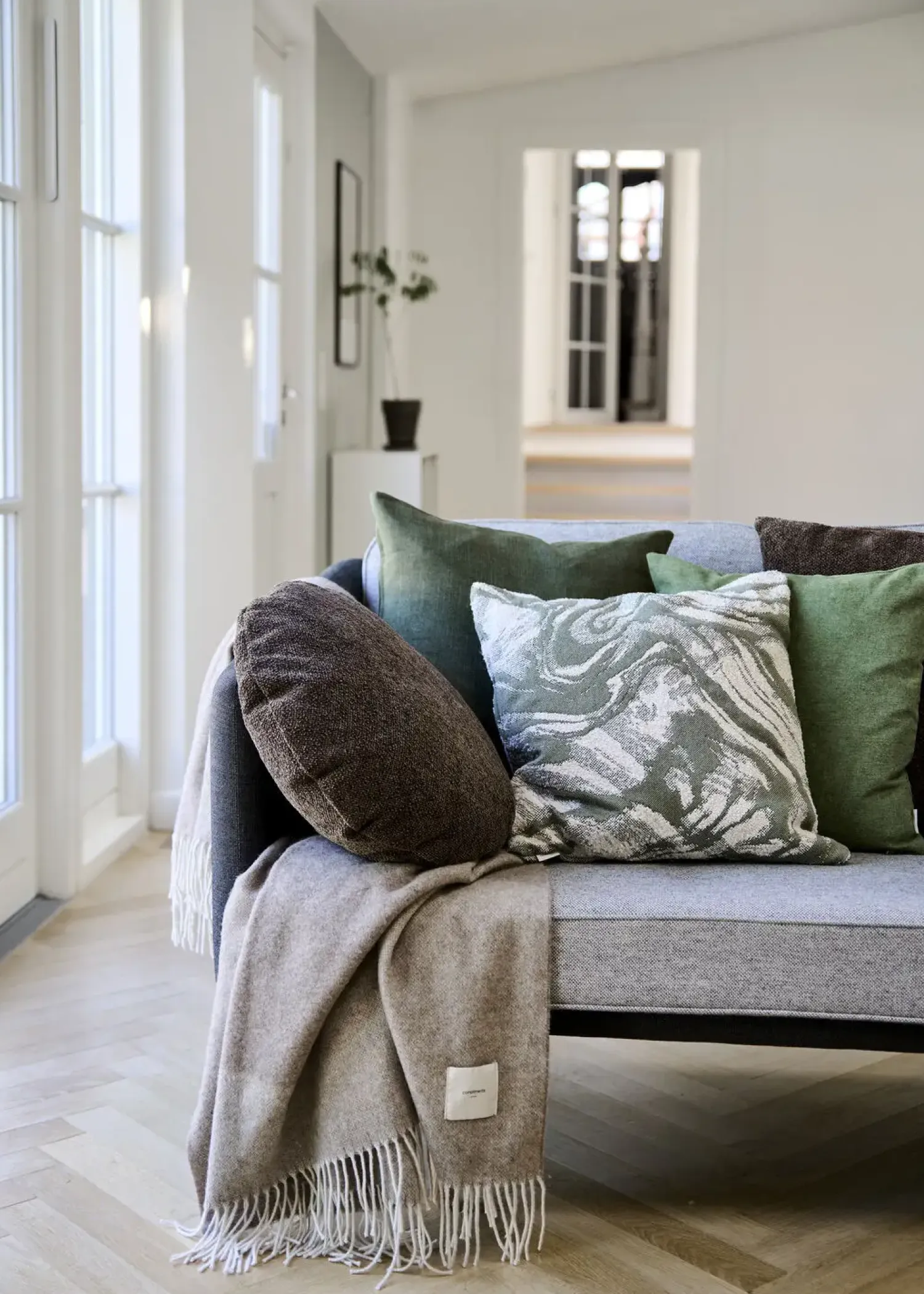 Ensfarvet Taffy pude i en enkel, luksuriøs bouclé, som evner at løfte rummets udtryk og skabe en særlig stemning. Taffy findes i flere størrelser og smukke farver.