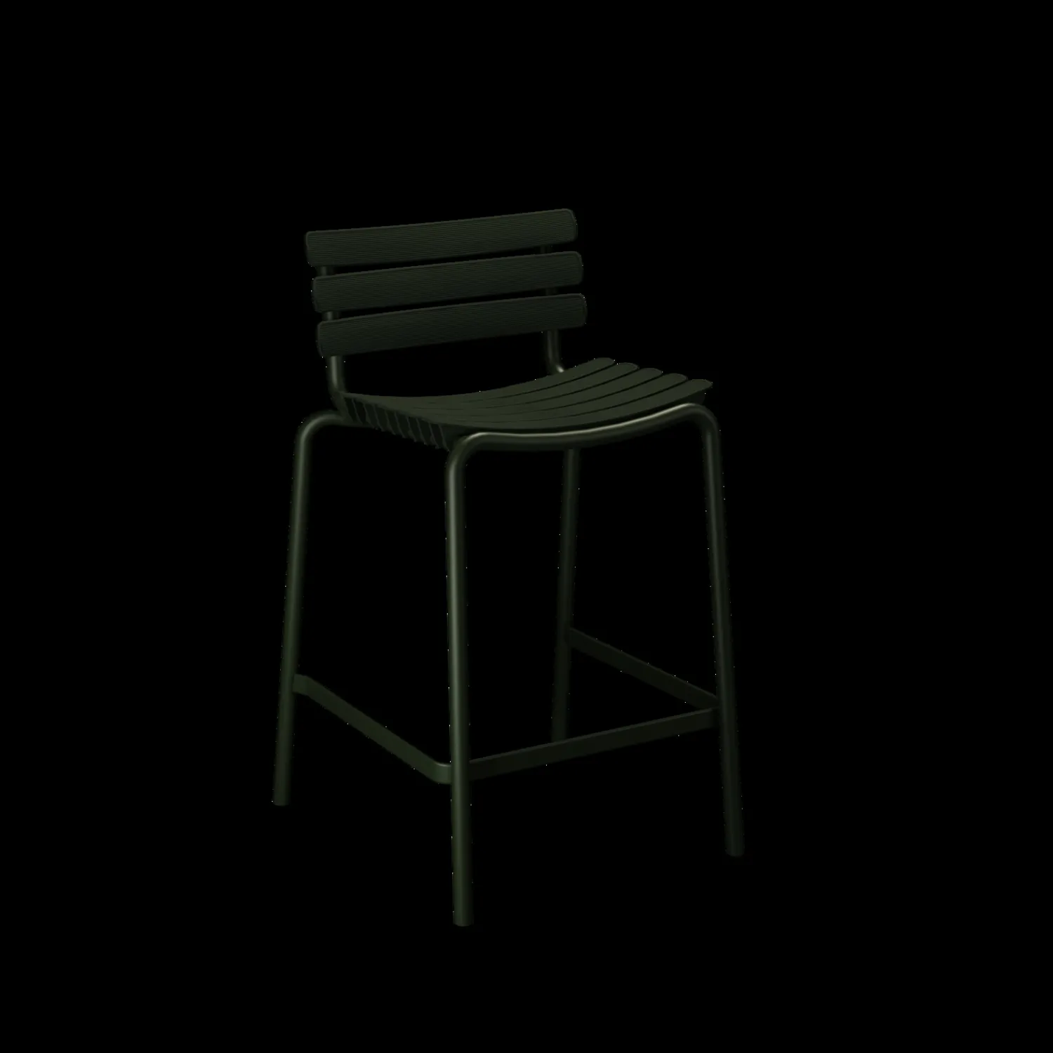 Denne counterstol er lavet af genbrugt dansk plastik og er både miljøvenlig og slidstærk. Den er velegnet til udendørs brug med sin aluminiumsramme og særlige vandrette lameller. Den er ideel til både private og kommercielle udendørsområder.