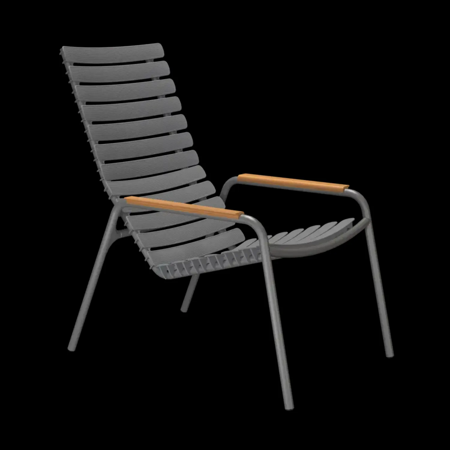 Produktion i Danmark sikrer omhyggelig forarbejdning. Lamellerne i genbrugsplast er miljøvenlige, mens bambusarmlænene giver et naturligt hvilepunkt for dine arme under afslapning. Stolen kombinerer funktionalitet med fokus på bæredygtige materialer.