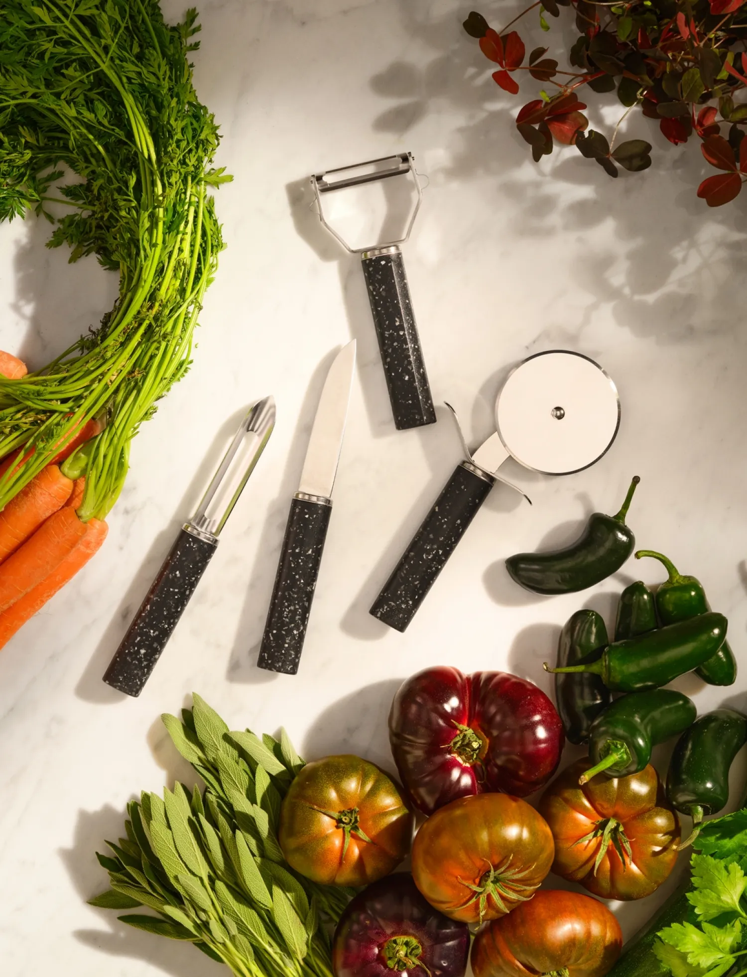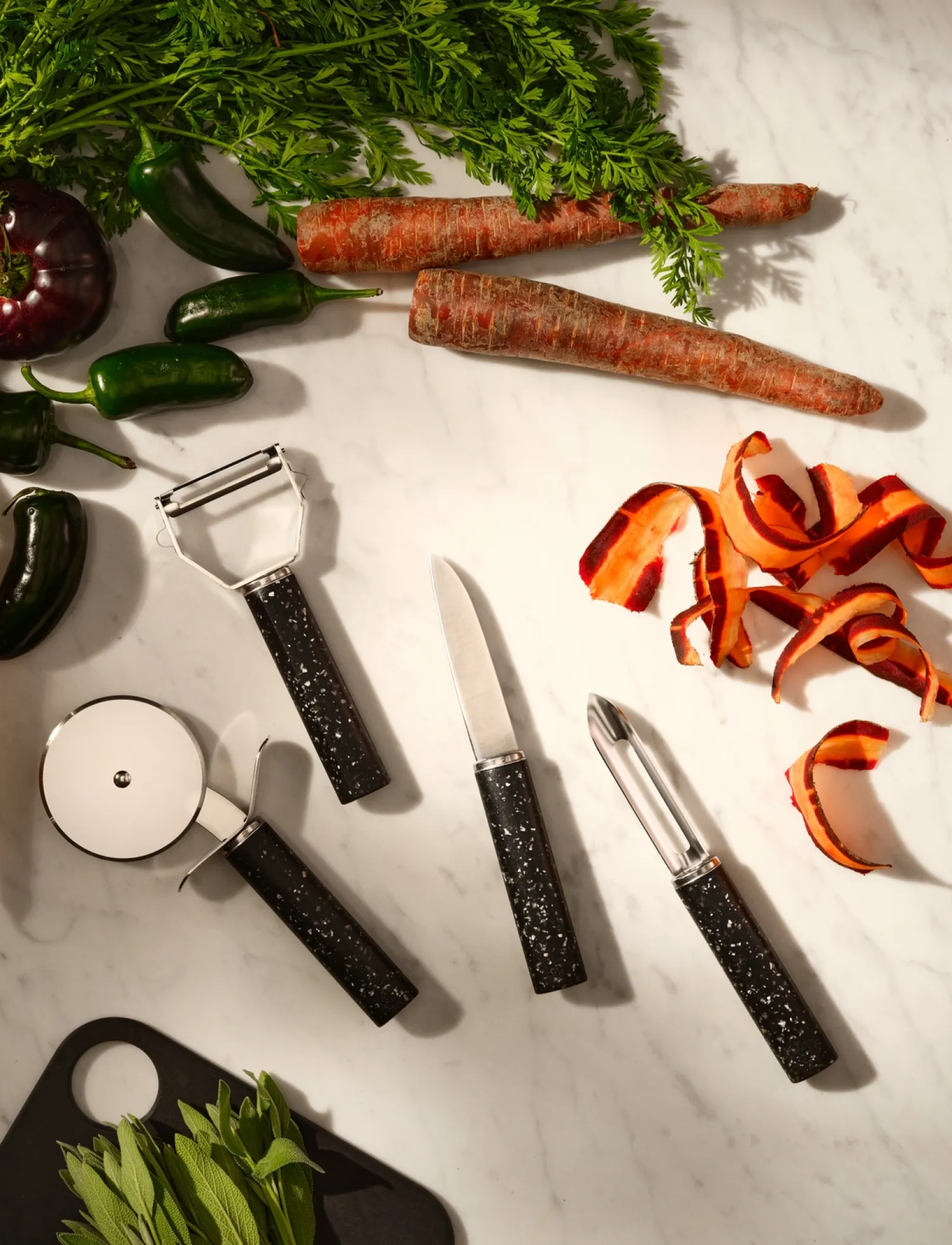 En klassisk skrællekniv, som tilhører serien REDO, kommer i rustfrit stål med et fast blad, der både er ekstremt holdbart samtidig med at det giver dig den fulde kontrol i brug. Håndtaget er lavet i 98% genbrugsplast, fremstillet af indsamlet forbrugsemballage. Grebet er formet efter en oldgammel Japansk grebsprofil, Shinogi, der sikrer et godt greb og øget kontrol i brug. Shinogi-grebet karakteriseres ved at have en vertikal kant på skaftet, der sikrer det gode greb, kontrol, og som desuden skaber et godt greb til både venstre- og højrehåndede.