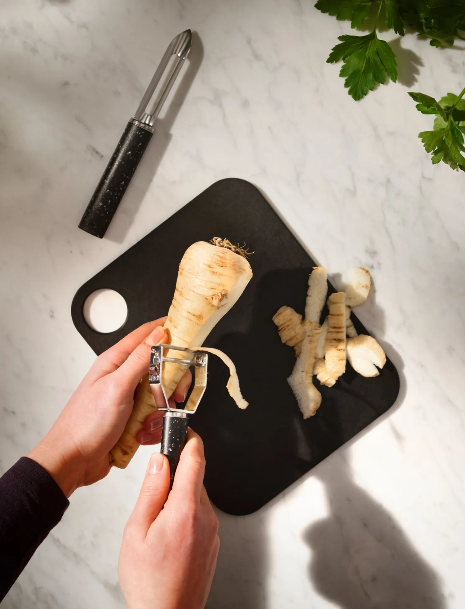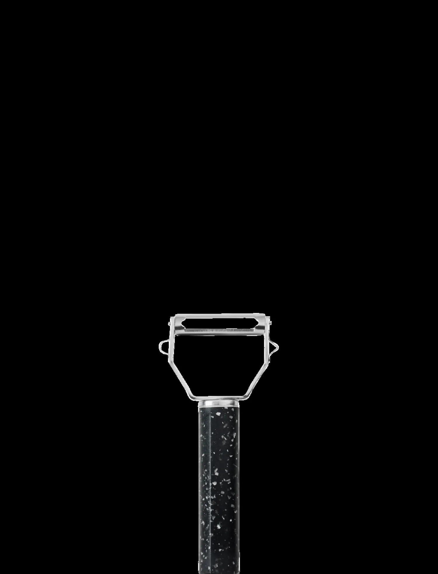 Y-skrælleren tilhører serien REDO. Skrælleren kommer i rustfrit stål med bevægeligt blad, der flugter grøntsagen for et bedre resultat. Håndtaget er lavet i 98% genbrugsplast, fremstillet af brugt emballage, der giver y-skrælleren et unikt nistret udtryk. Y-skrælleren har en stålramme med to skarpe kroge på hver side i forskellige størrelser designet til at fjerne knopper og øjne på grønsagerne. Grebet er formet efter en oldgammel Japansk grebsprofil, Shinogi, der sikrer et godt greb og øget kontrol i brug. Shinogi-grebet karakteriseres ved at have en vertikal kant på skaftet, der sikrer det gode greb, kontrol, og som desuden skaber et godt greb til både venstre- og højrehåndede.