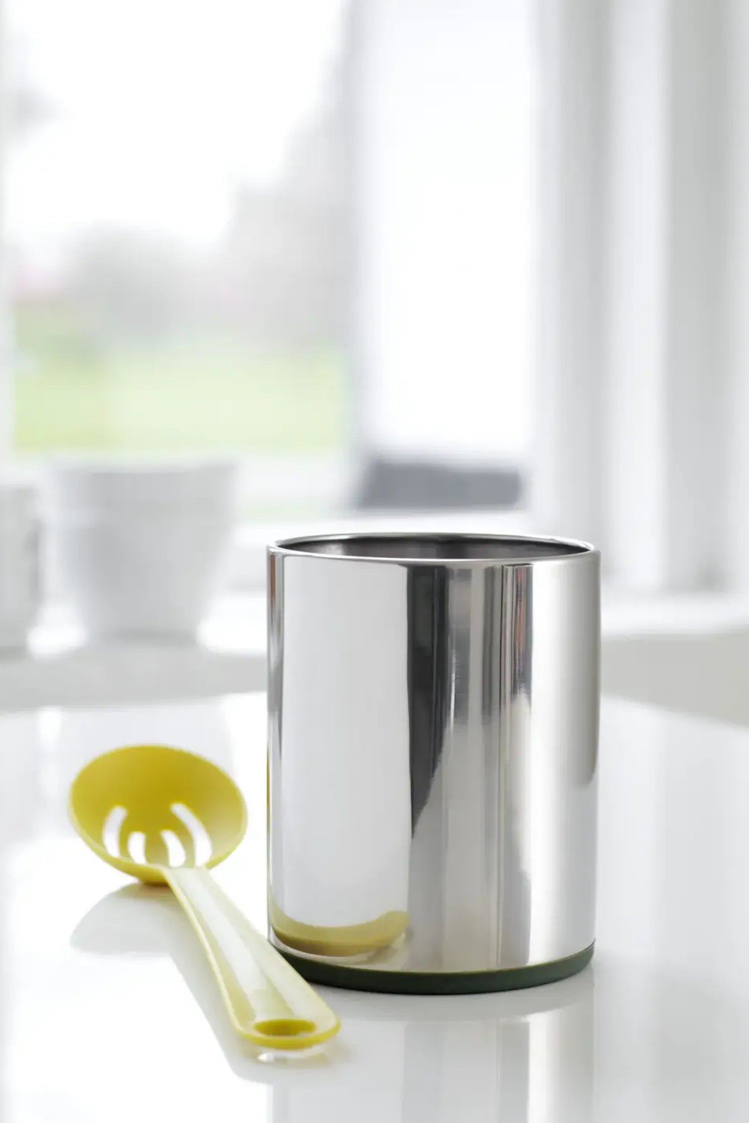 Denne redskabsholder i poleret rustfrit stål giver dig en praktisk løsning til dine køkkenredskaber. Den cylindriske form kombinerer holdbarhed med et rengøringsvenligt design, mens den grønne silikonebund beskytter dine overflader.