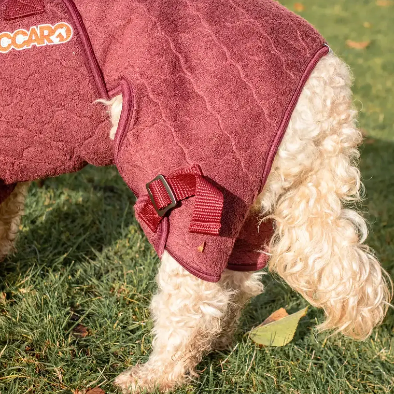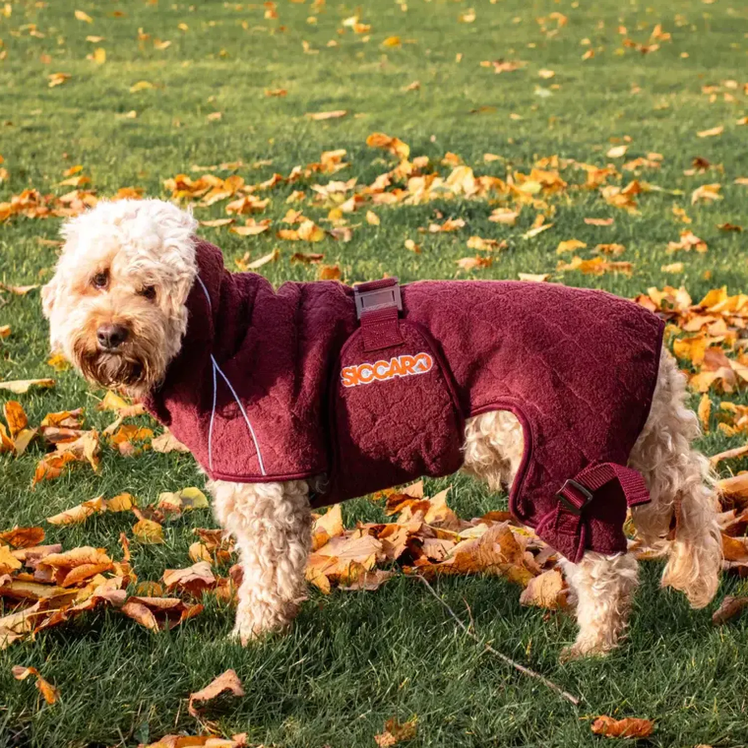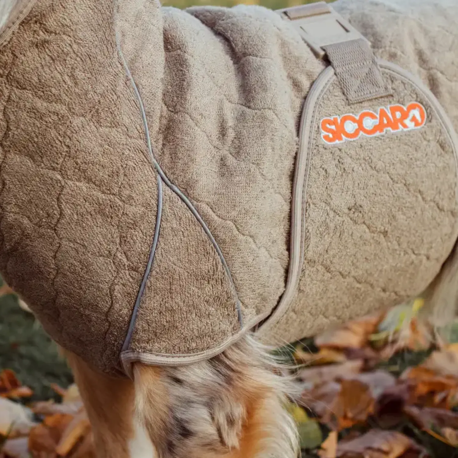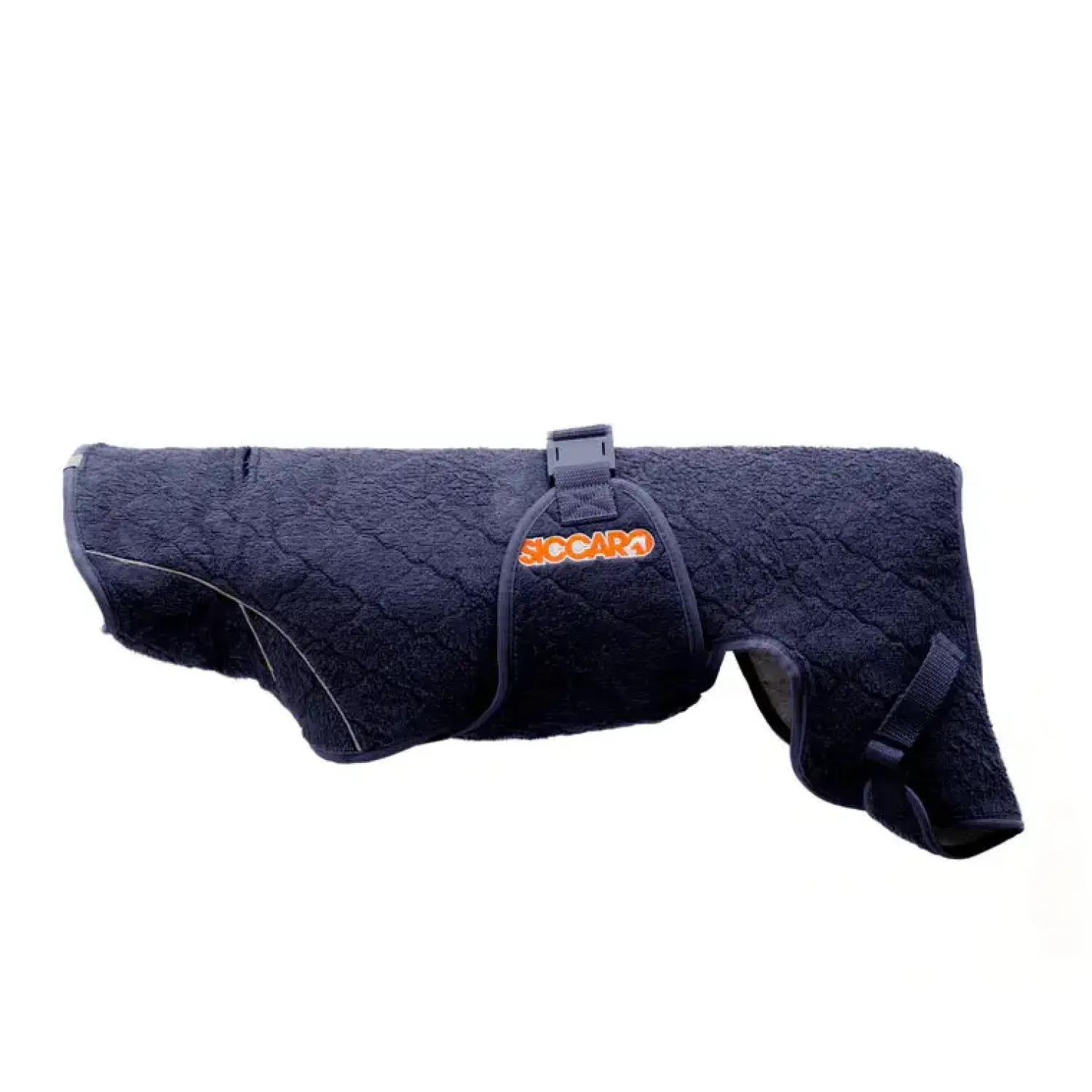 Solution-hunde-tørrepelsen har maksimal sugeevne med 400g Wet2Dry-stof plus maksimal dækning af hunden med ekstra stof til at vikle rundt om de lodne bagben. Solution modellen er specielt beregnet til meget pelsede hunde, som har brug for lidt ekstra kraft for at blive helt tørre. Spar både tid og kræfter og glem alt om ildelugtende håndklæder, når din våde hund skal tørres efter et bad, en tur på stranden eller en tur i regnen. Som den eneste af vores tørrerober har Solution et hul i nakken, der giver adgang til en krave eller sele, så frakken også nemt kan bruges, mens du går. Størrelse 40 er den mindste størrelse vi har i Solution modellen. Den passer for eksempel til hunde som Springer Spaniels, mellemstore pudler eller de mindre “doodle” blandinger. Du bør dog altid måle din hund for at finde den rigtige størrelse. Du kan se hvordan i vores størrelsesguide. Hænges til tørre efter brug. Vask efter behov. Kan vaskes i vaskemaskine ved 30 grader celsius. Brug helst vaskemiddel uden enzymer eller andre skånsomme produkter. Ingen skyllemiddel.