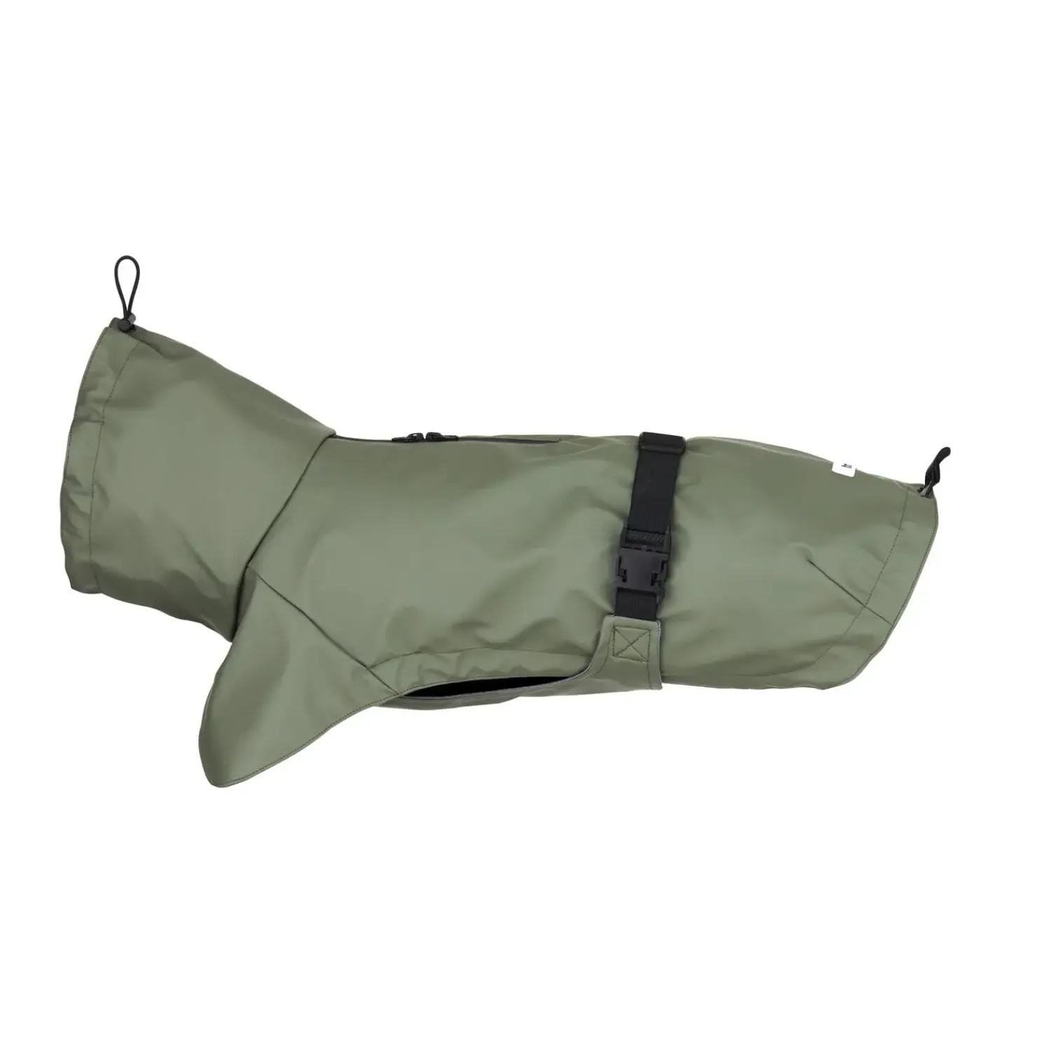 Regnjakken kan tilpasses din hund ved hjælp af elastiske stropper henholdsvis nær hale og hoved samt bæltet omkring kroppen. Kraven kan også foldes. Indvendig er der et for, der gør jakken meget behagelig for din hund.