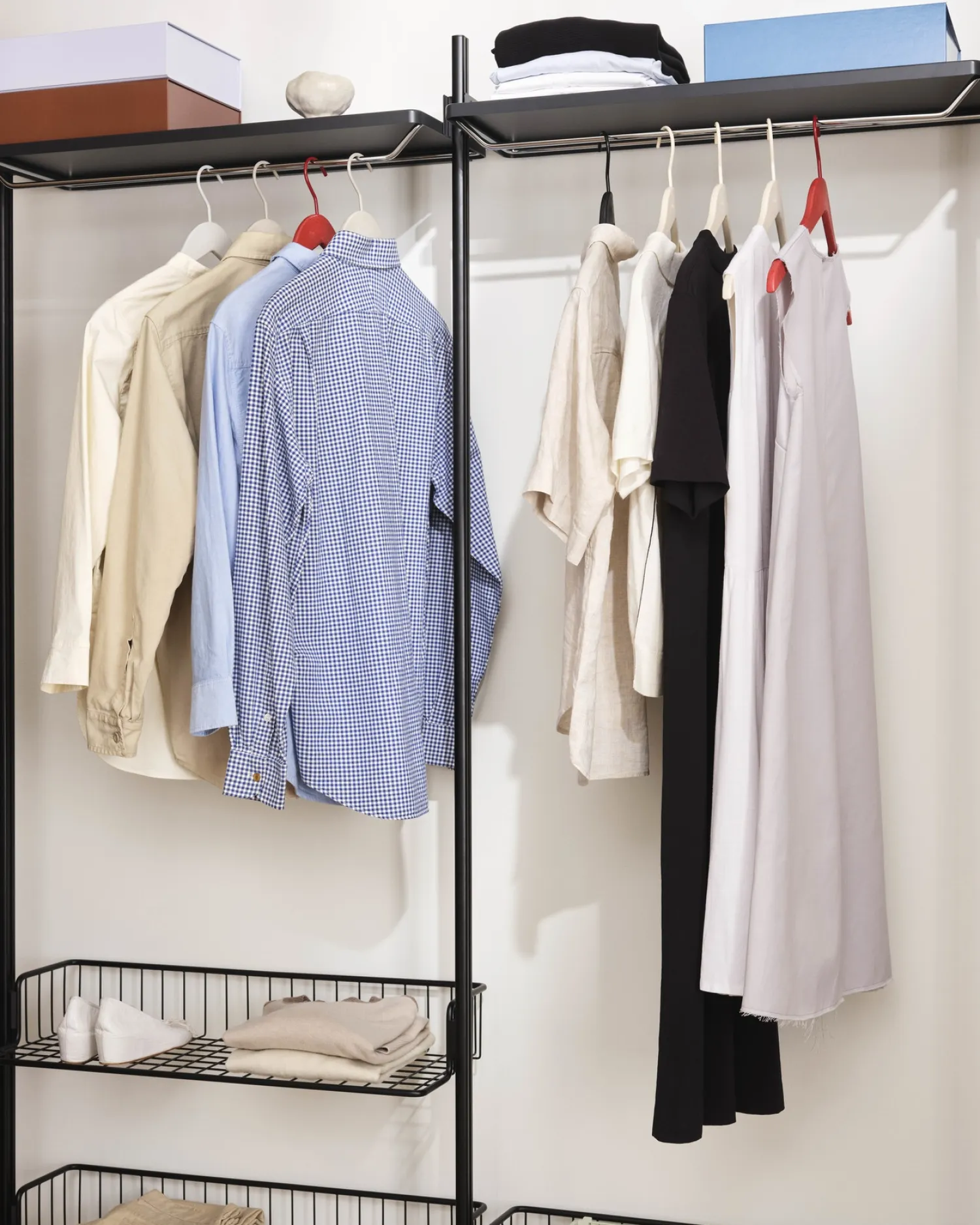 Den sorte farve og det enkle design passer ind i enhver indretning. Du får både en tøjstang til beklædning og en bundkurv til mindre genstande. Den robuste konstruktion i anodiseret stål sikrer, at reolen holder sig flot i mange år.