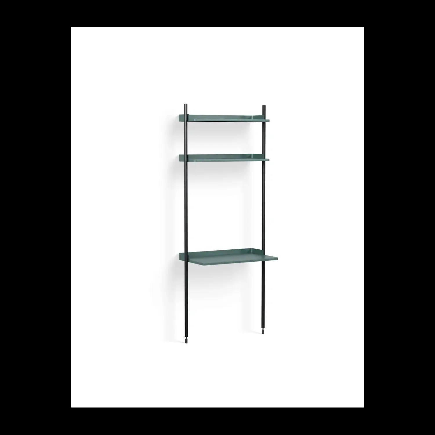 Denne reol fra Hays Pier-system kombinerer holdbart anodiseret stål med en gennemtænkt konstruktion. De blå hylder og sorte støtter skaber en moderne kontrast, mens materialerne sikrer stabilitet og lang levetid.