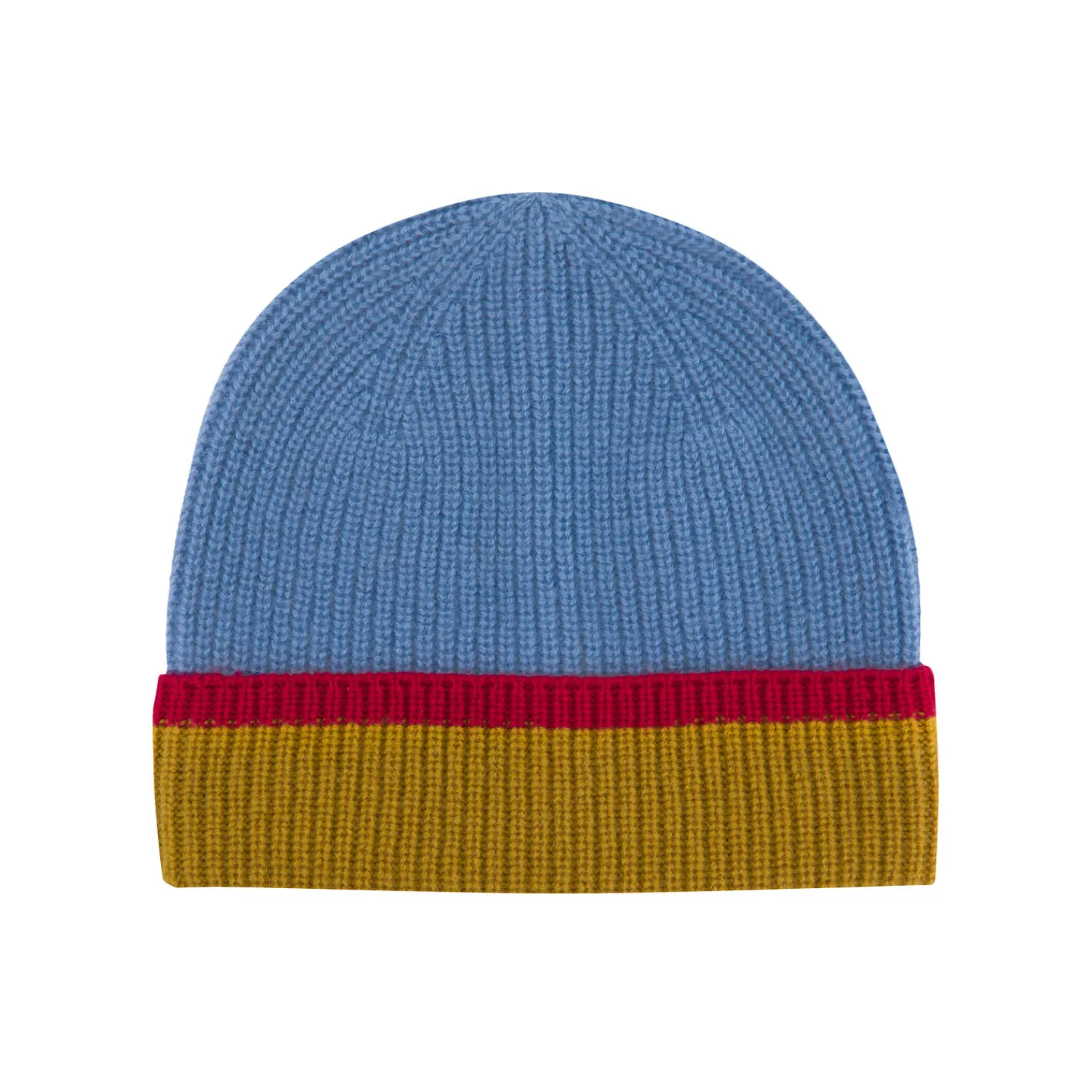 Denne hue er ikke kun æstetisk tiltalende, men også utrolig behagelig at have på. Blandingen af 90% uld og 10% kashmir sikrer optimal varme og blødhed mod huden. Ulden bidrager med sin naturlige varmeregulerende egenskab, mens kashmiren tilfører en ekstra blødhed og luksus. Den praktiske størrelse gør den let at bære og opbevare, hvilket gør den til et alsidigt tilbehør til enhver garderobe. Hattens farveblokerende stil med en blå top, rød stribe og sennepsfarvet bund giver den et moderne og trendy udseende.
