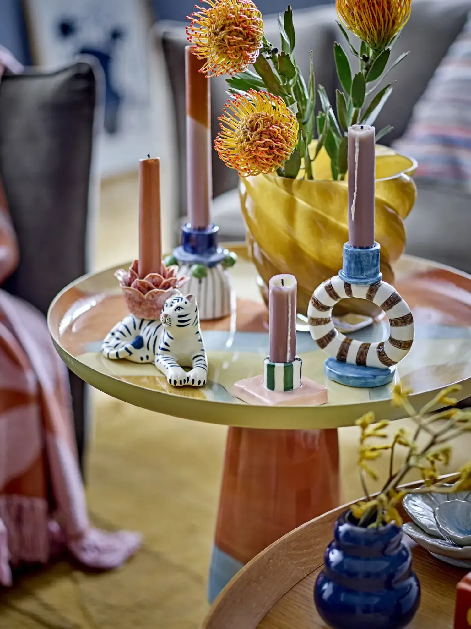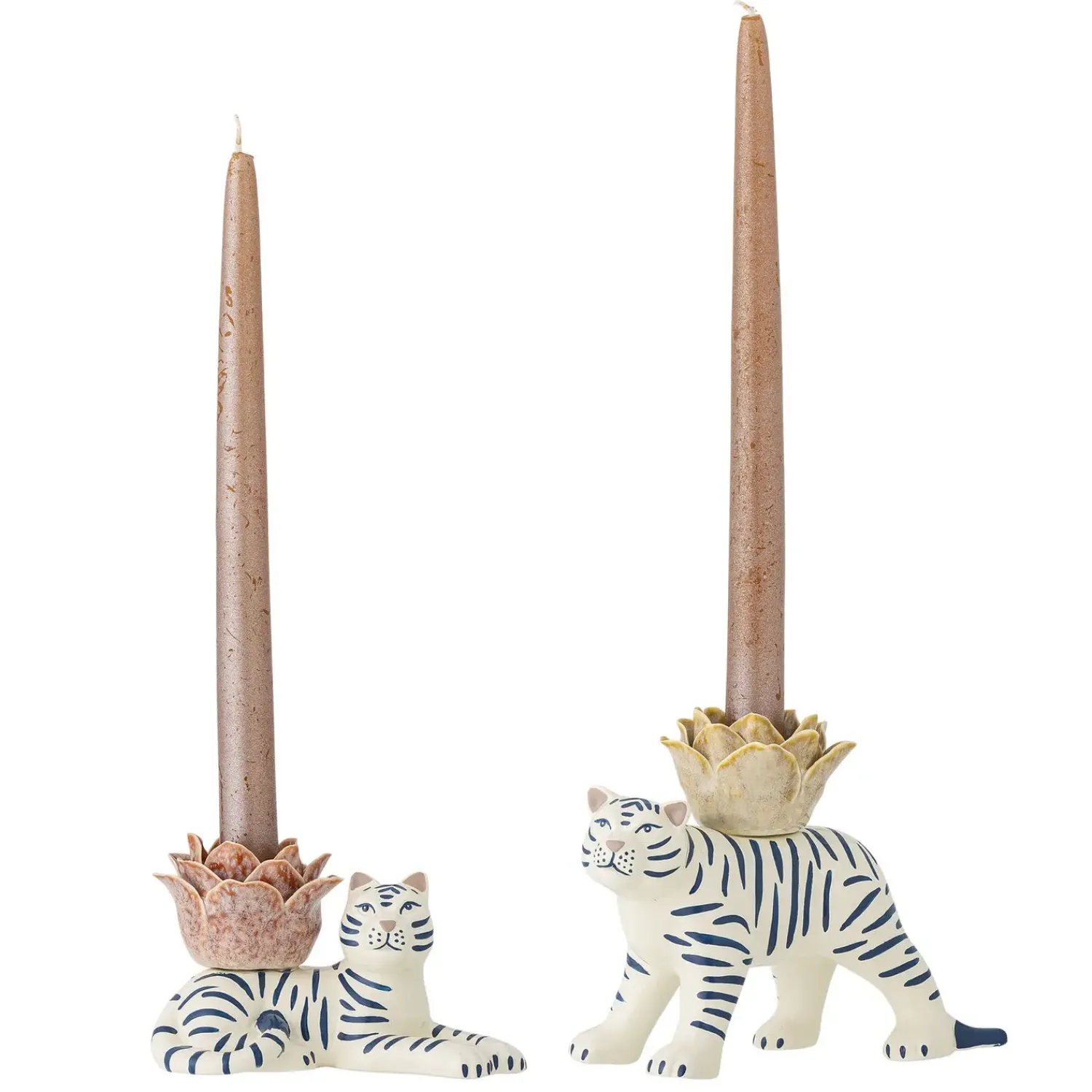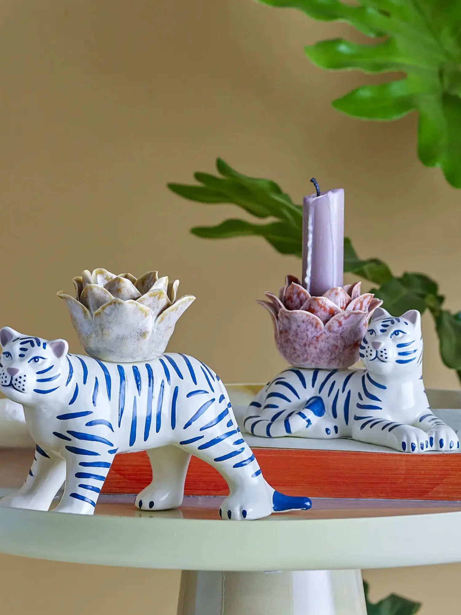 Hånddekorerede lysestager i holdbart stentøj, der giver dit hjem et kunstnerisk præg. Sættet består af to tigerfigurer i forskellige størrelser, hver med en blomsterformet lyseholder på ryggen.