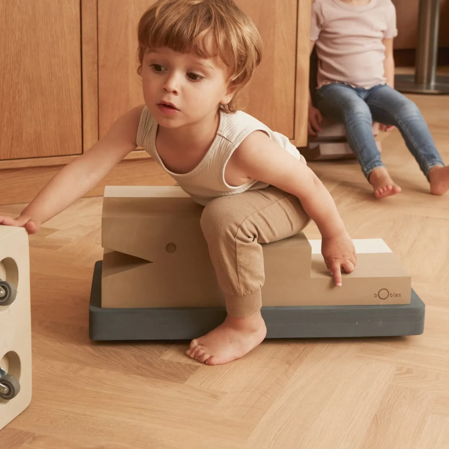 Sus i maven og vind i håret – den følelse kan man hverken være for ung eller blive for gammel til, og bObles Tumlebræt er garant for begge dele.Stimuler både vestibulærsans og muskelledsans når den lille ligger på maven på Tumlebræt og spænder op i hele kroppen af begejstring og eventyrsglæde. Læg et andet tumlemøbel på Tumlebræt og pludselig forvandler det sig til en racerbil eller et flyvende tæppe. Lad den helt lille baby suse mellem sine forældre og bedsteforældre, mens Kylling hjælper med at løfte hovedet, så der er masser af kontakt og nærvær. Eller sæt en Elefant i ryggen på den siddende baby, som pludselig har fået en lynhurtig bil. Jo ældre barnet blive des vildere kan bObles-bilen blive. Det skridsikre EVA-skum gør det let af slippe fantasien løs, når der skal leges.Tumlingen vil elske at transportere legetøj og service rundt, når der skal hjælpes med borddækningen. Og det store barn vil nyde at suse rundt af egne kræfter enten på maven ved hjælp af armene eller på numsen med brug af benene. Sidstnævnte er fantastisk til at styrke og træne haserne på barnet.