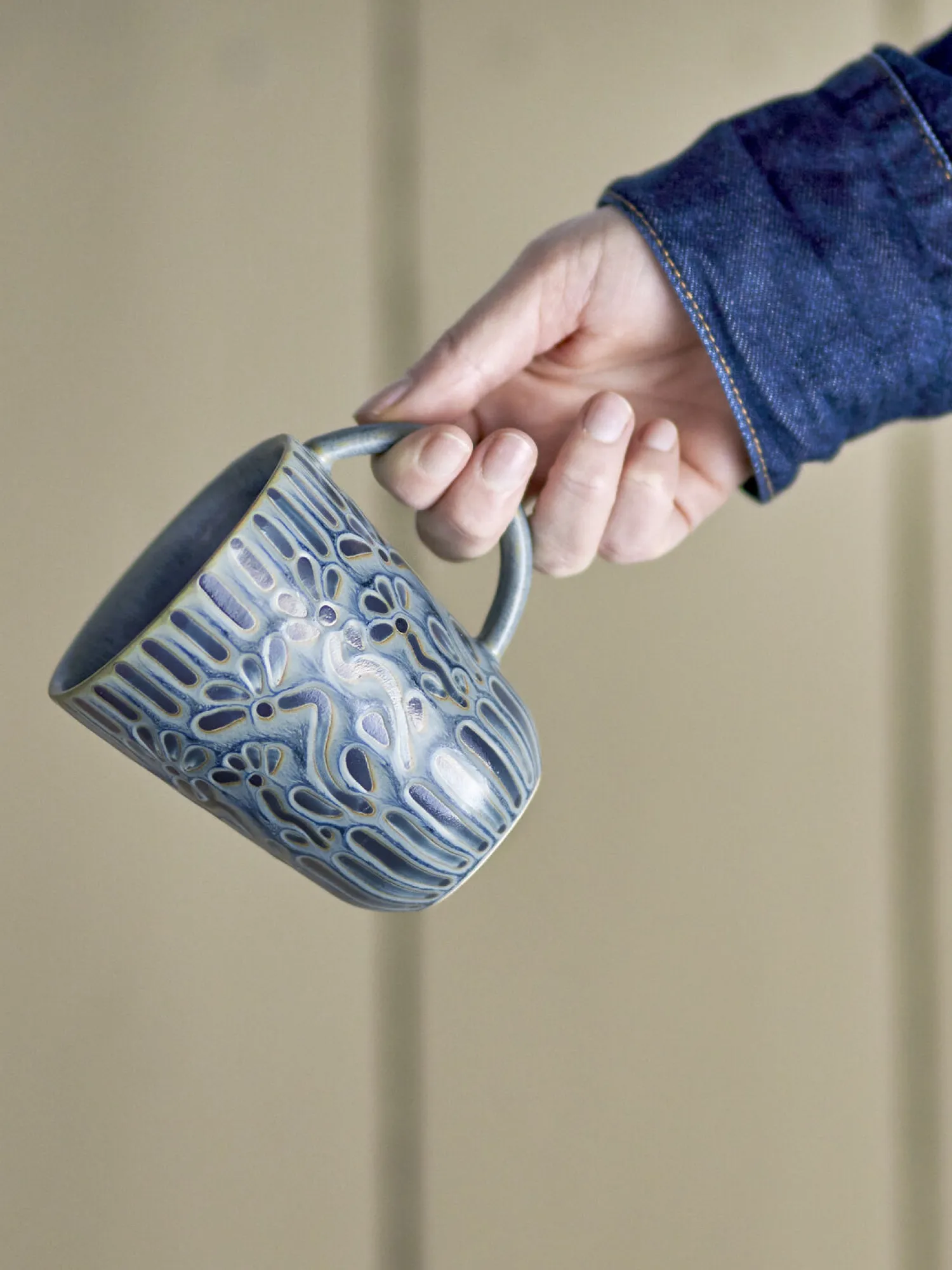 Dette håndlavede stentøjskrus fra Bloomingville kombinerer holdbarhed med hverdagskomfort. Den reaktive blå glasur og det prægede mønster giver hvert krus sit eget særpræg, mens den robuste konstruktion sikrer lang levetid ved din daglige brug.