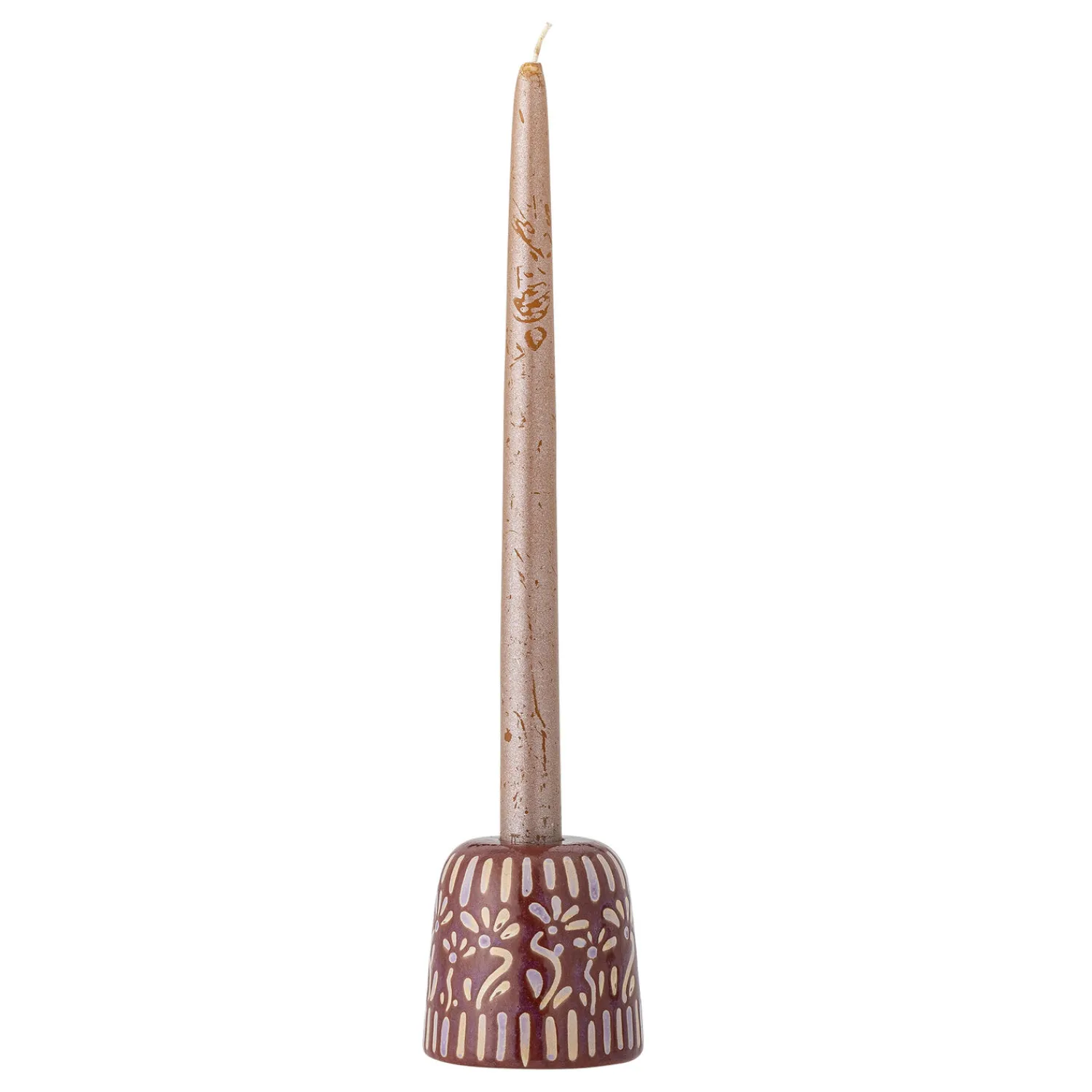 Denne håndlavede lysestage i stentøj byder på en karakteristisk lilla farve med dekorative mønstre. Den reaktive glasur skaber fine blomster- og linjemønstre, der gør hver lysestage forskellig i sit udtryk.