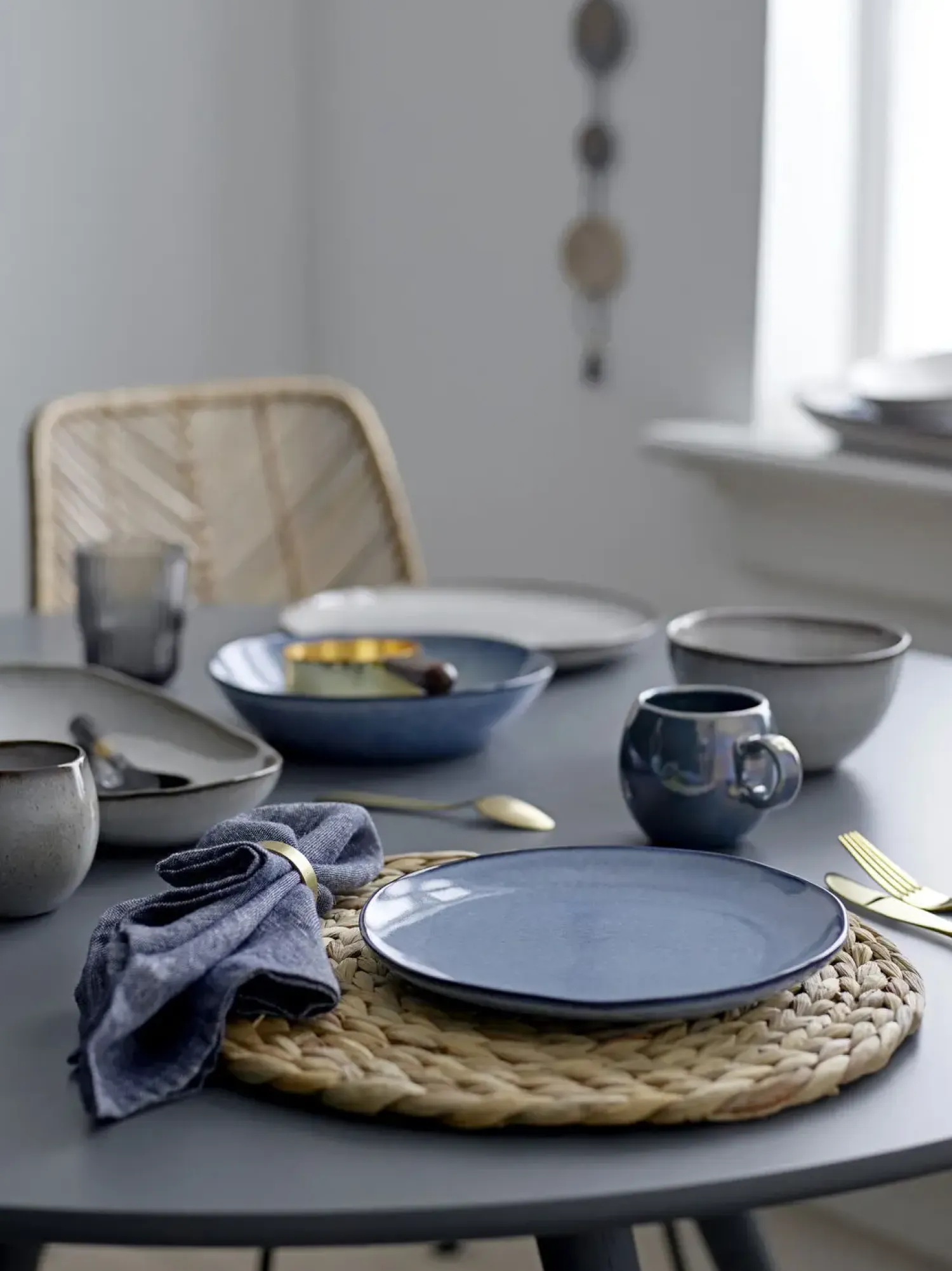 Dette håndlavede stentøjssæt giver dig holdbart service til hverdagens måltider. Hver del har sin egen unikke karakter gennem den blå glasering, og materialevalget sikrer, at dit service holder sig flot gennem daglig brug.