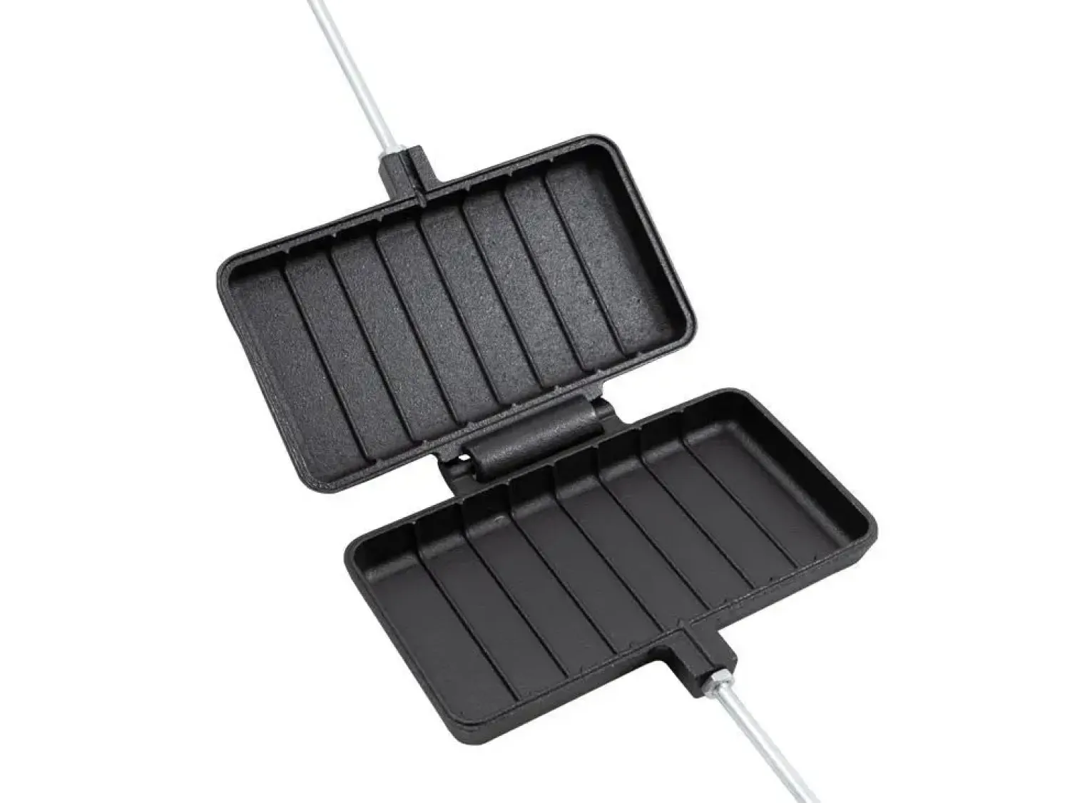 Tag din udendørs madlavning til nye højder med Muurikka Sandwichjern. Dette robuste redskab er designet til at skabe lækre, sprøde sandwiches over bål eller grill og gør det muligt at nyde hjemmelavede delikatesser midt i naturen. Det lange metalhåndtag sikrer en sikker afstand til ilden og muliggør sikker brug over åben ild, mens træhåndtaget giver et komfortabelt greb.