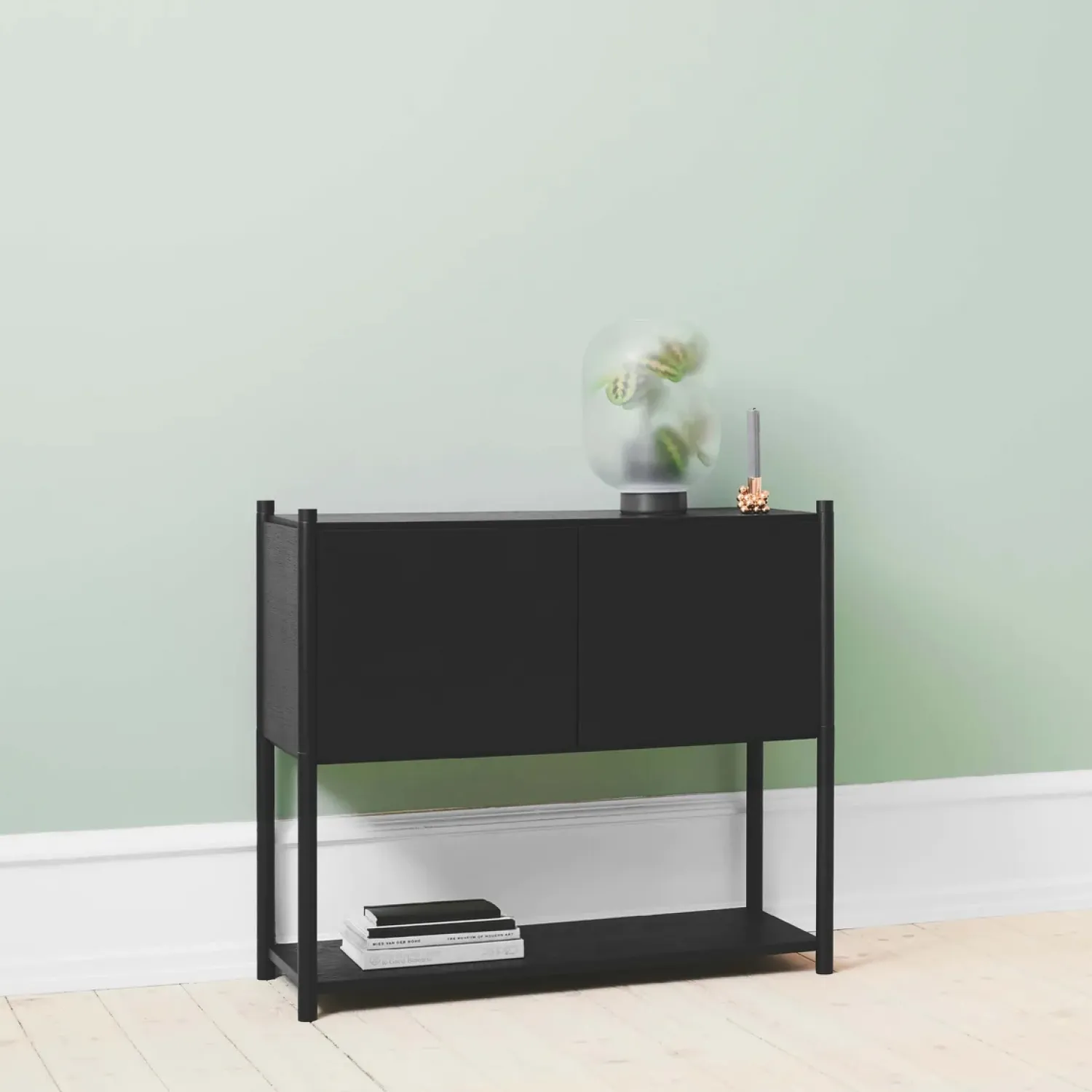 Super fin reol fra Gejst. Sceene reol c er et modulopbygget reolsystem, som giver en mulighed for at skabe sin egen personlige reol. Du kan være kreativ og skabe en opbevarings løsning, der passer præcis til de behov du har. Reolen er lavet således, at det øverste modul har fået tilføjet to sidepaneler, et bagpanel og frontlågerne kan åbnes op.
