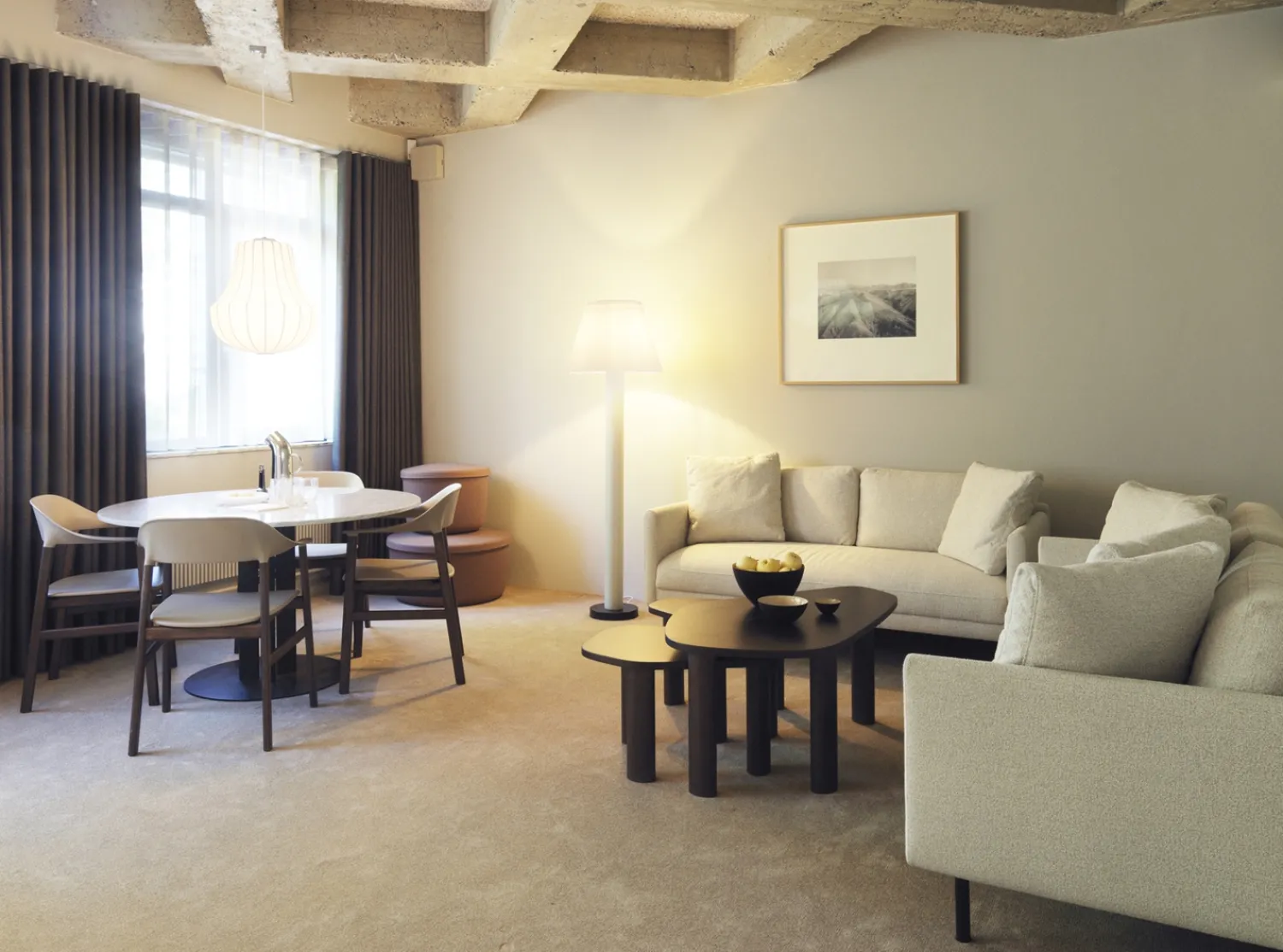 Den brune bejdsning beskytter ikke kun træet; den fremhæver også askens naturlige åretegning. Bordets organiske form skaber en blød kontrast til de lige linjer i rummet, mens de afrundede kanter gør det børnevenligt.