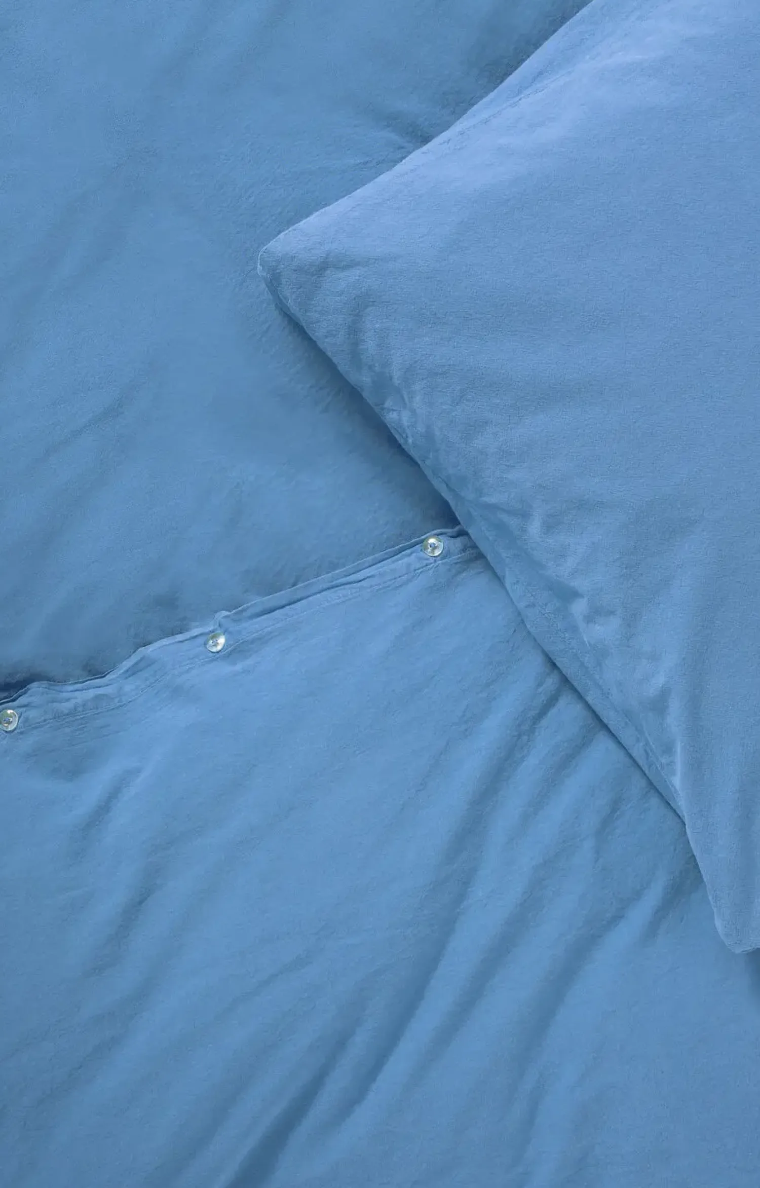De transparente knapper på dynebetrækket og den praktiske kuvertlukning på pudebetrækket gør det nemt at skifte sengetøj. Den oceanblå farve skaber en rolig stemning i soveværelset.