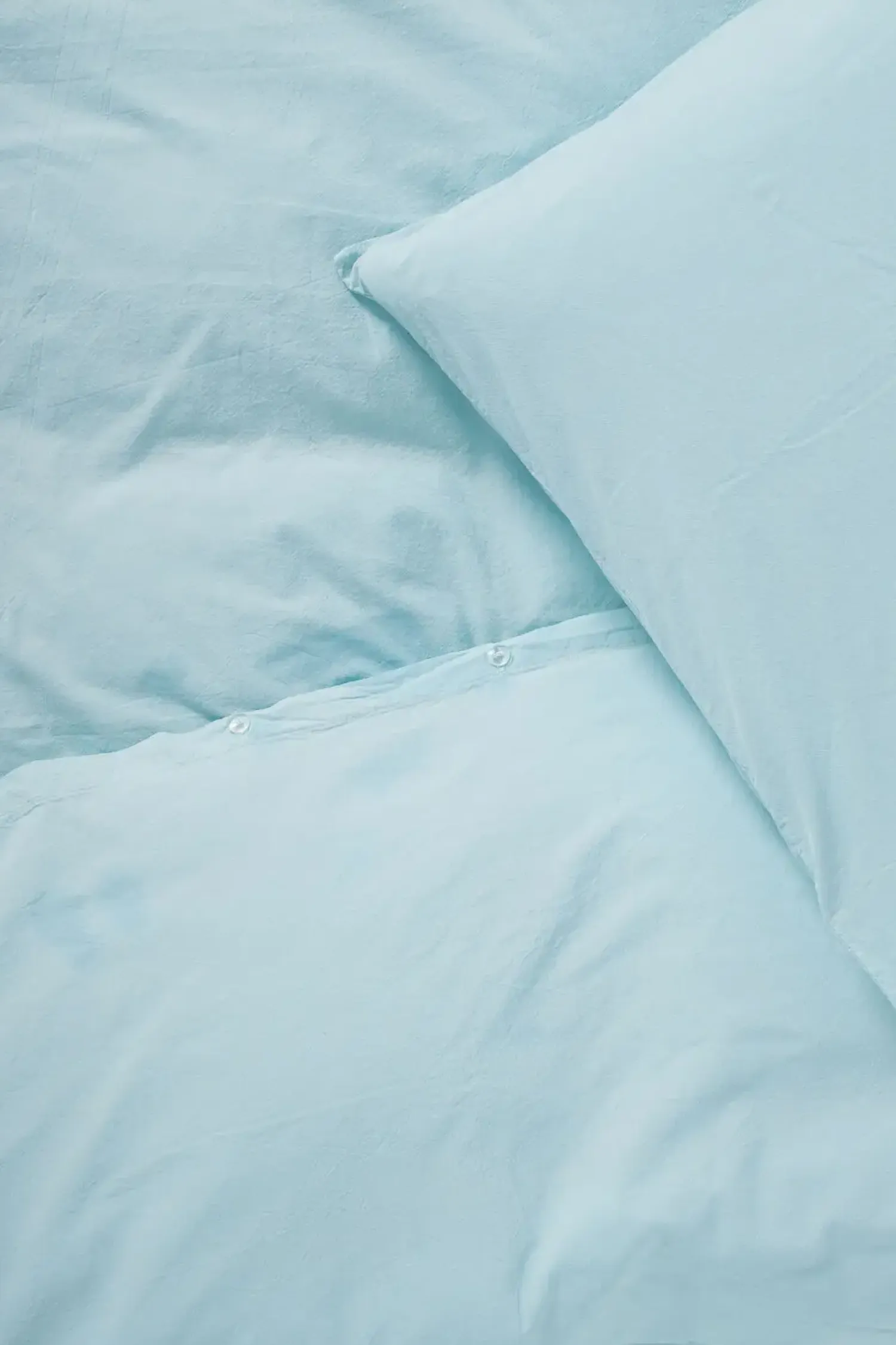 Dynebetrækket er udstyret med transparente knapper, der giver et diskret look, mens pudebetrækket har en praktisk kuvertlukning. Den himmelblå farve skaber en rolig stemning i soveværelset, og den stenvaskede overflade tilfører et særligt præg til dit sengemiljø.
