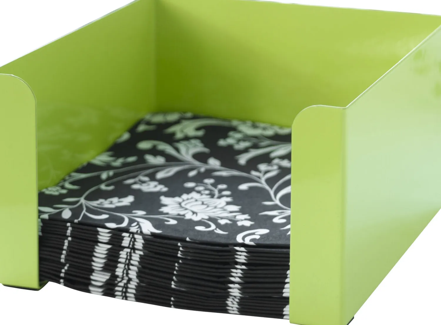 Denne servietholder i rustfrit stål med grøn pulverlakering gør det nemt at holde styr på dine servietter. Med målene 17 x 17 x 8,5 cm passer den til store frokostservietter og optager minimal bordplads.