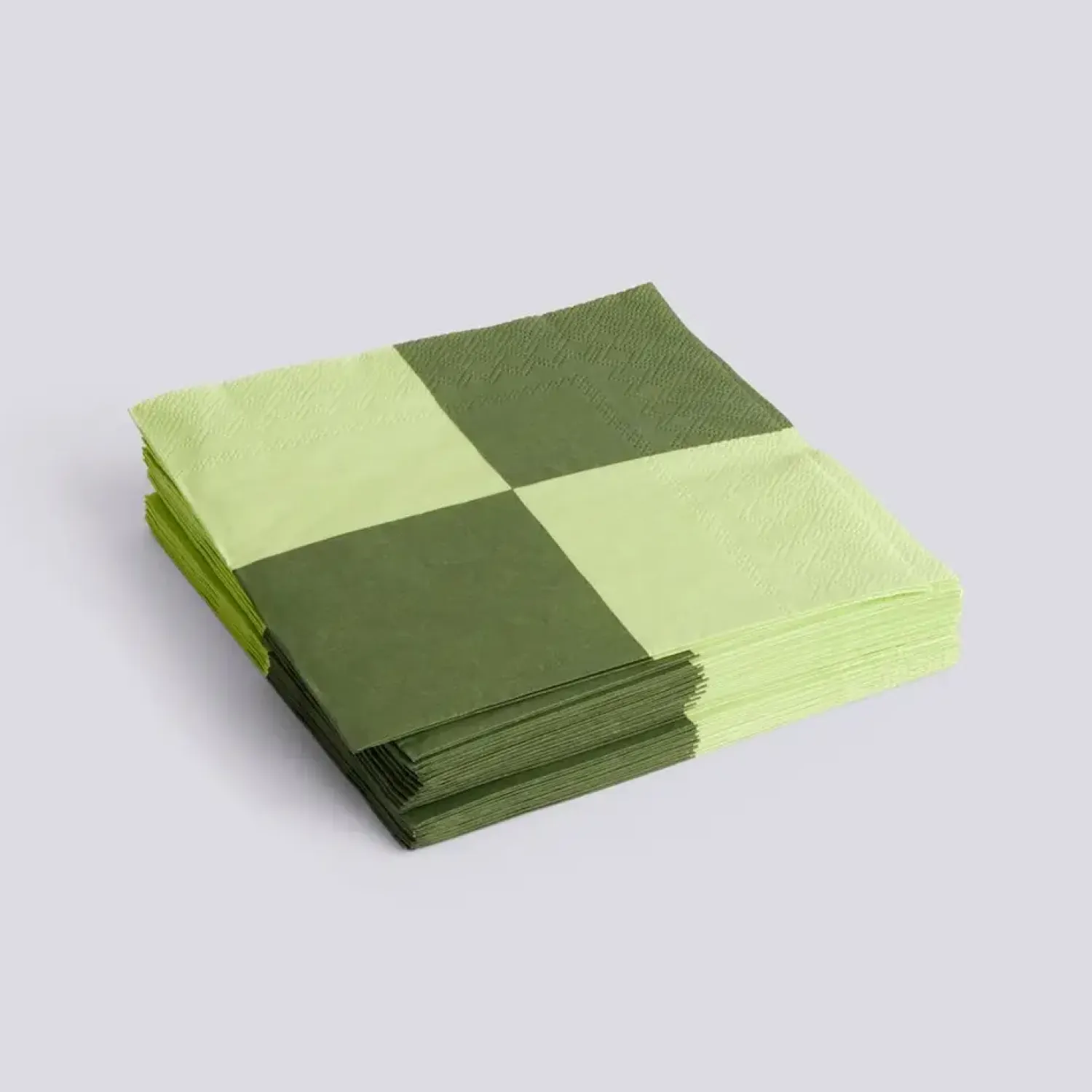 Disse middagsservietter fra Hay kombinerer to grønne nuancer i et grafisk ternmønster. Med målene 40×40 cm får du servietter til din borddækning, der giver god dækning og kan foldes på forskellige måder. Pakken indeholder 20 papirservietter.