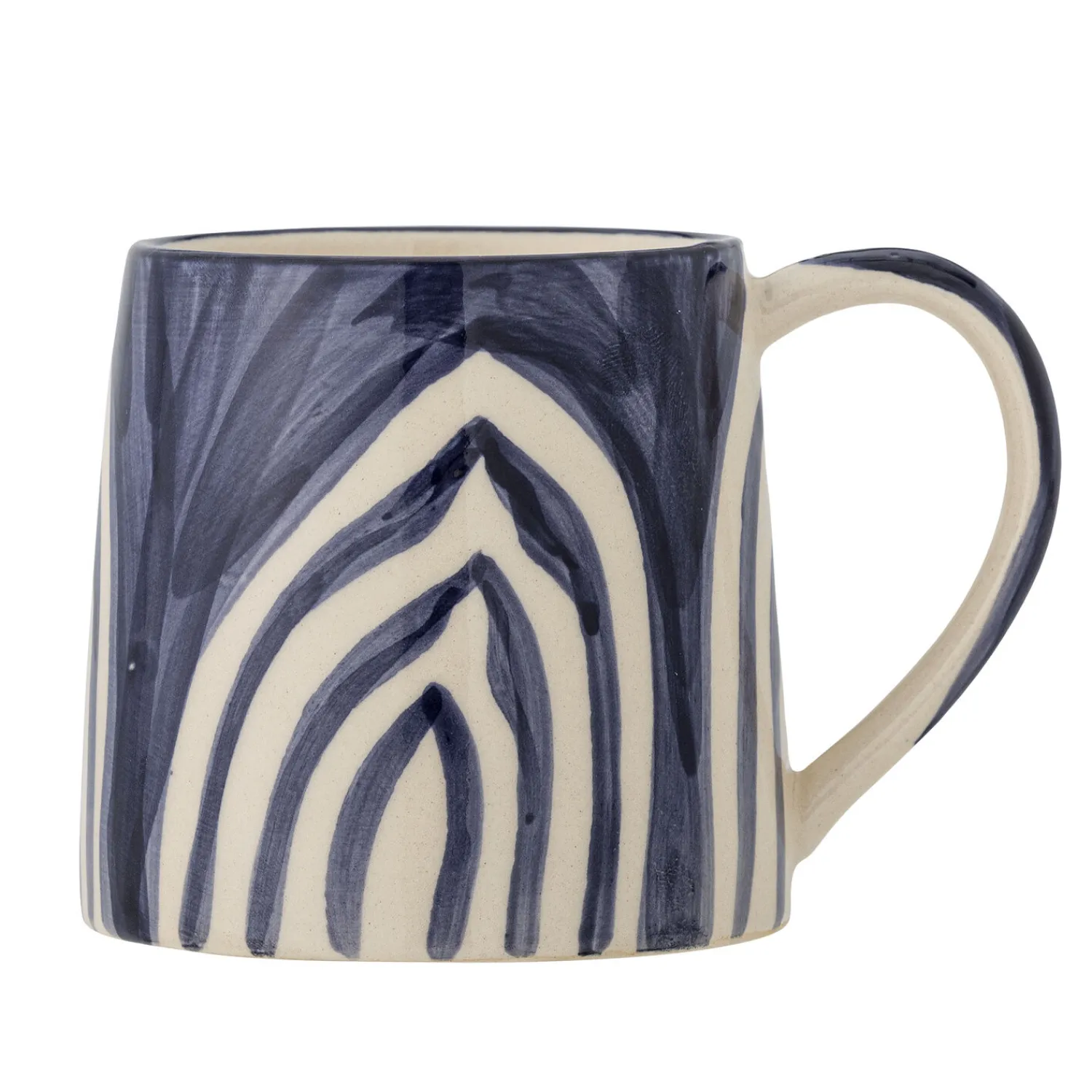 Hånddekoreret stentøjskop med et distinkt geometrisk mønster i blå og hvid. Den let tilspidsede form giver koppen karakter, mens det praktiske håndtag sikrer et godt greb. Hver kop har sin egen unikke finish.