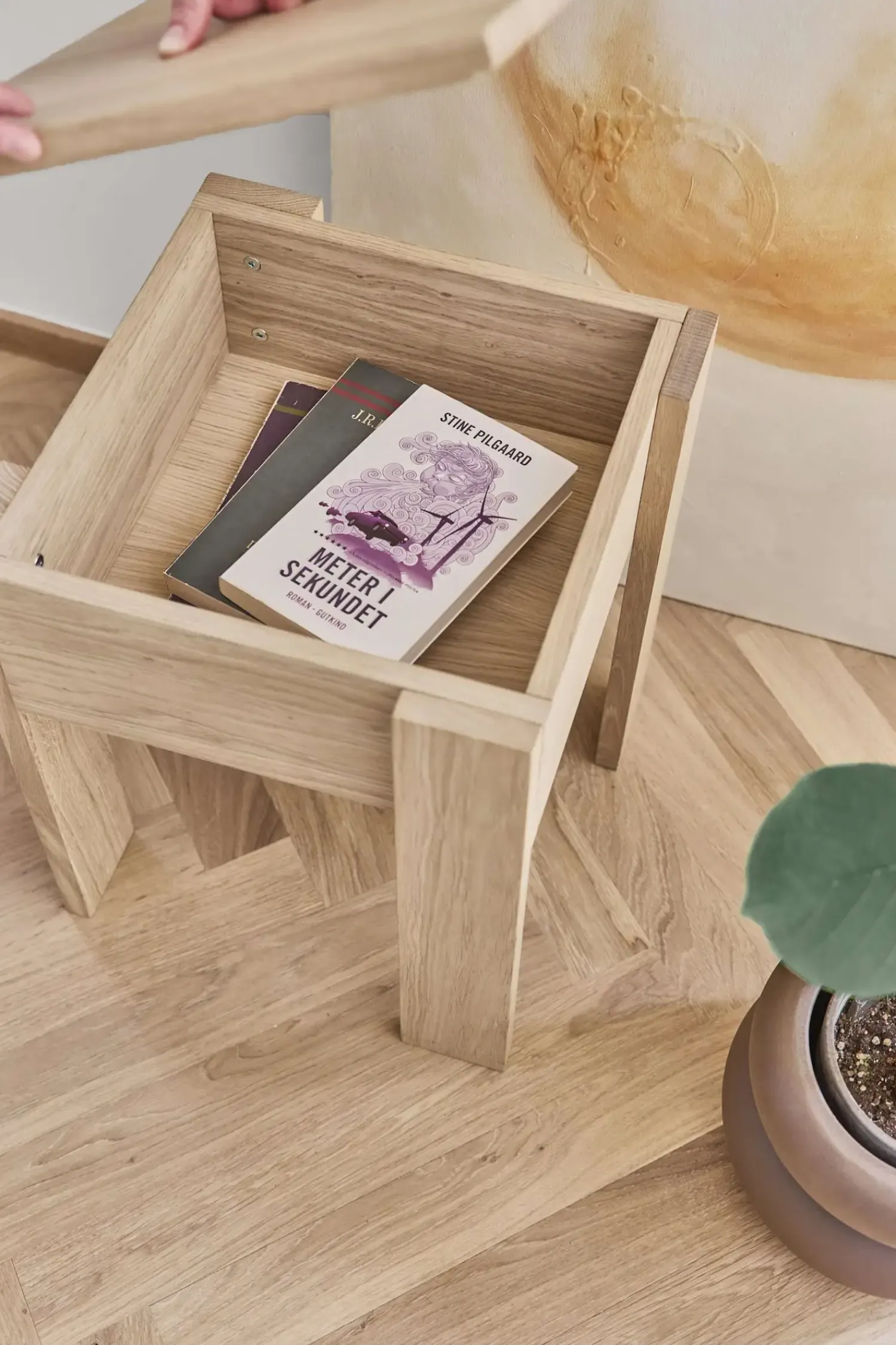 Den aftagelige bordplade giver nem adgang til opbevaringsrummet, hvor du kan gemme fjernbetjeninger, tidsskrifter eller andre hverdagsting. Det gør det nemt at holde stuen ryddelig og organiseret uden at gå på kompromis med designet.