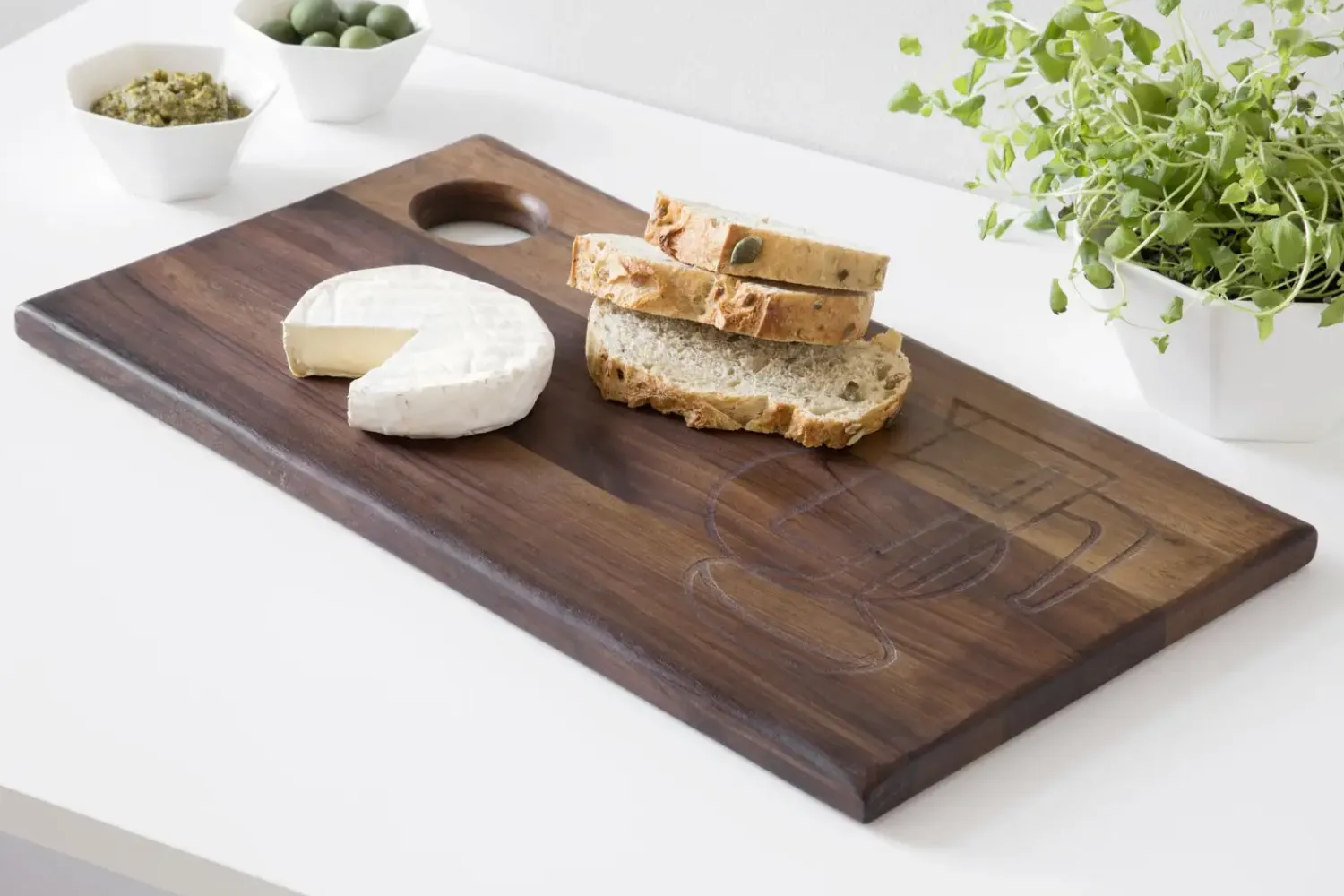 Med det integrerede ophængningshul kan du nemt gemme skærebrættet væk, når det ikke er i brug. Når du skal servere, fungerer den samme udskæring som et praktisk håndtag, der gør det let at bære brættet med mad og drikke.