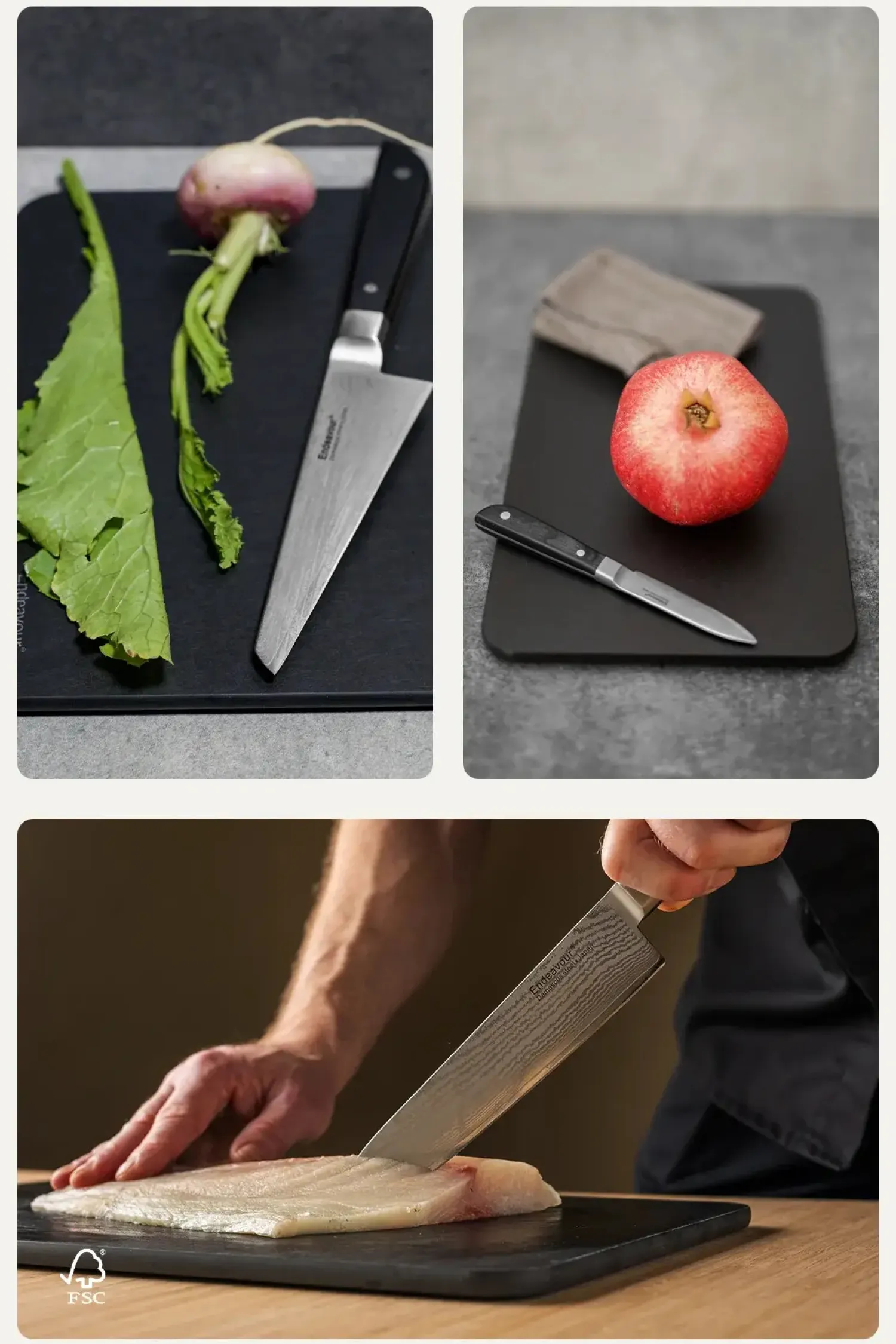 Skærebrættet er lavet af bæredygtige sammenpressede træfibre, hvilket gør det til et miljøvenligt valg. Træfibrene er holdbare og modstandsdygtige over for slid, hvilket forlænger skærebrættets levetid. Dette betyder, at du kan nyde godt af et skærebræt, der bevarer sin funktionalitet og æstetik over tid, samtidig med at det er skånsomt mod miljøet.