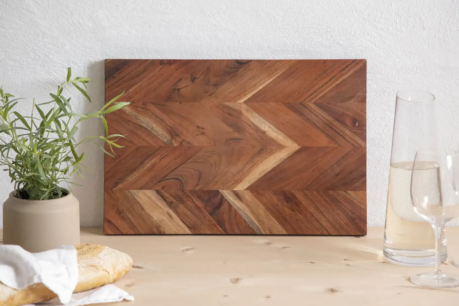 Dette skærebræt i hårdt akacietræ kombinerer holdbarhed med funktionalitet. Sildebensmønsteret giver et særligt udtryk til dit køkken, mens materialets egenskaber skåner dine knive og sikrer en lang levetid.
