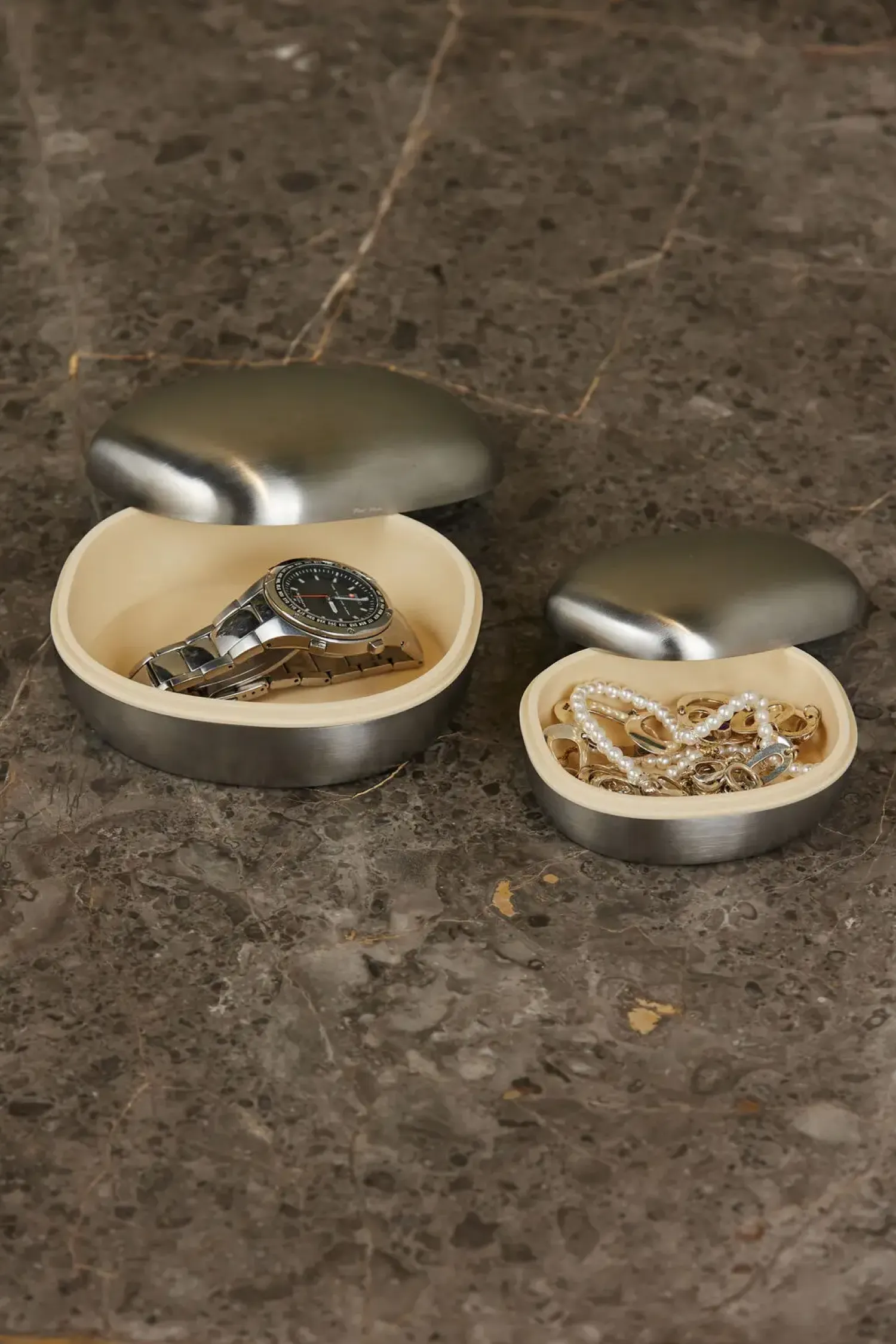 Dette smykkeskrin er formet som Piet Heins ikoniske superellipse og kombinerer tidløst design med praktisk funktion. Det blanke eller børstede stål giver et stilrent og sofistikeret udtryk, mens det bløde indlæg beskytter dine smykker.