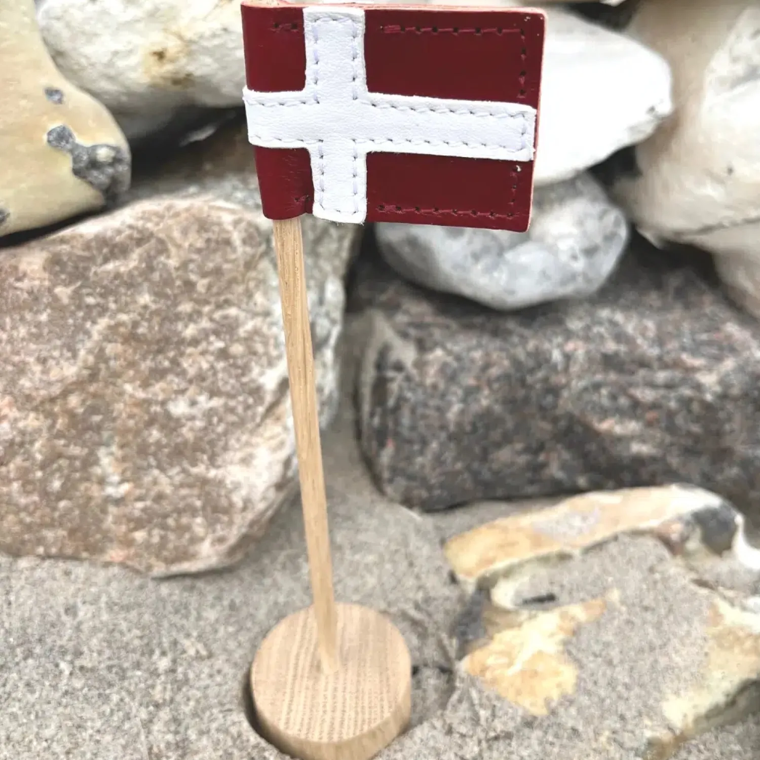 Lavet i hånden i eg med flag i restskind.