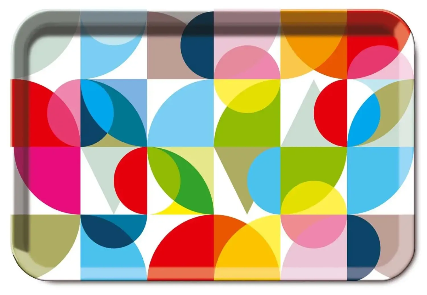 Solena-bakken udmærker sig ved sit moderne, flerfarvede mønster, der består af overlappende halvcirkler og buede former. Dette unikke design tilfører et friskt og dynamisk præg til ethvert rum. Den flade overflade gør bakken velegnet til bæring og servering, hvilket gør den praktisk til forskellige formål i hjemmet. Bakkens rektangulære form med afrundede hjørner kombinerer æstetik med funktionalitet og gør den nem at placere og bruge i forskellige sammenhænge.
